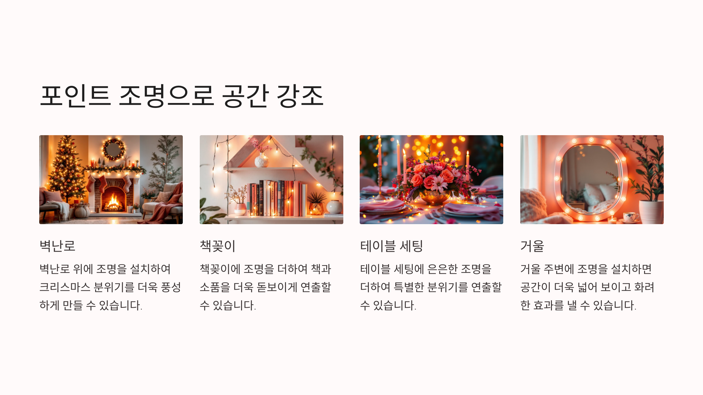 포인트 조명은 전체적인 장식과 균형을 이루도록 배치하세요.