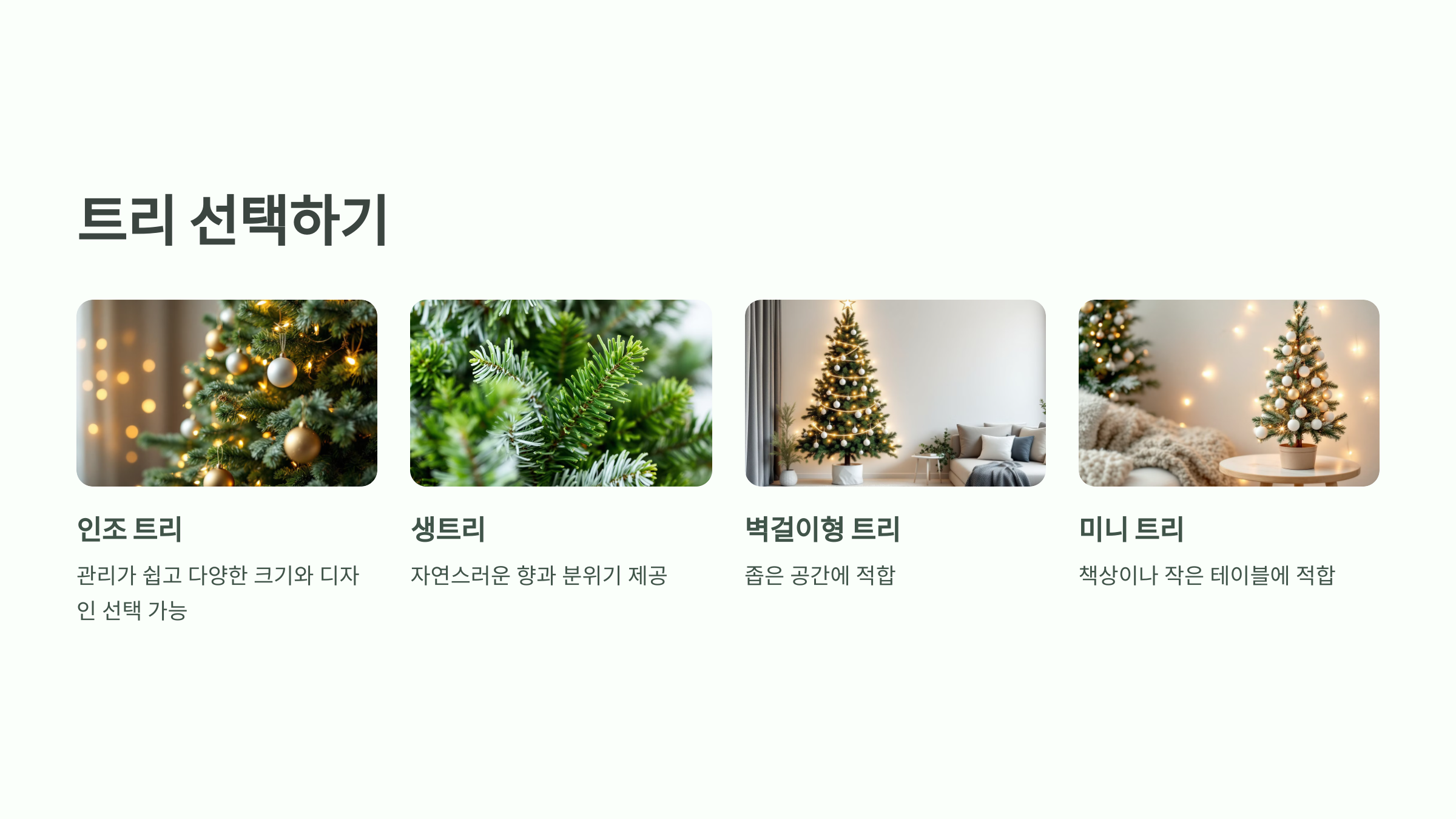크리스마스 인테리어의 중심은 단연 트리입니다. 공간에 어울리는 트리 선택부터 장식 아이디어, 조명 연출까지! 트리 하나로 집 안을 크리스마스 분위기로 가득 채울 수 있는 꿀팁을 확인해보세요.