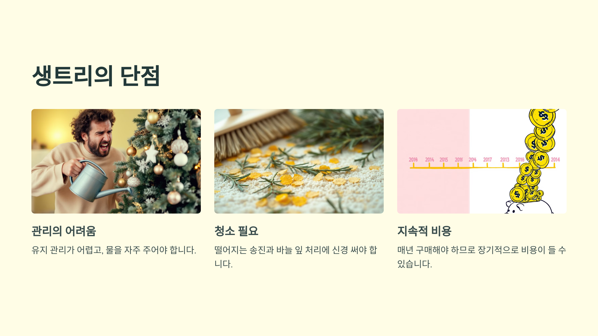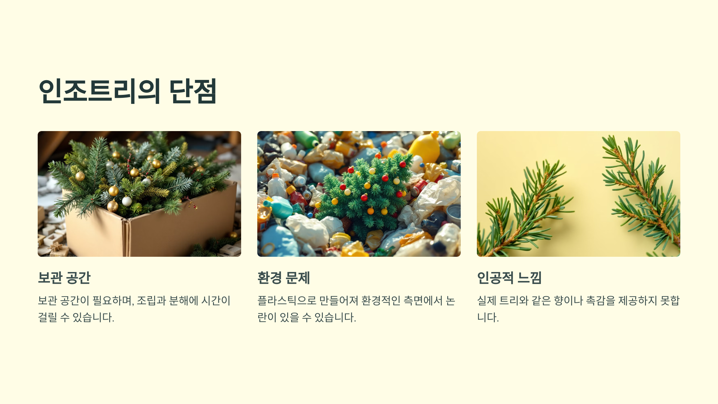 크리스마스 트리를 준비할 때 생트리와 인조트리 중 어떤 것을 선택할지 고민될 때가 많습니다. 각각의 장단점과 환경적, 비용적 요소를 꼼꼼히 비교해보고 자신에게 맞는 트리를 찾아보세요!
