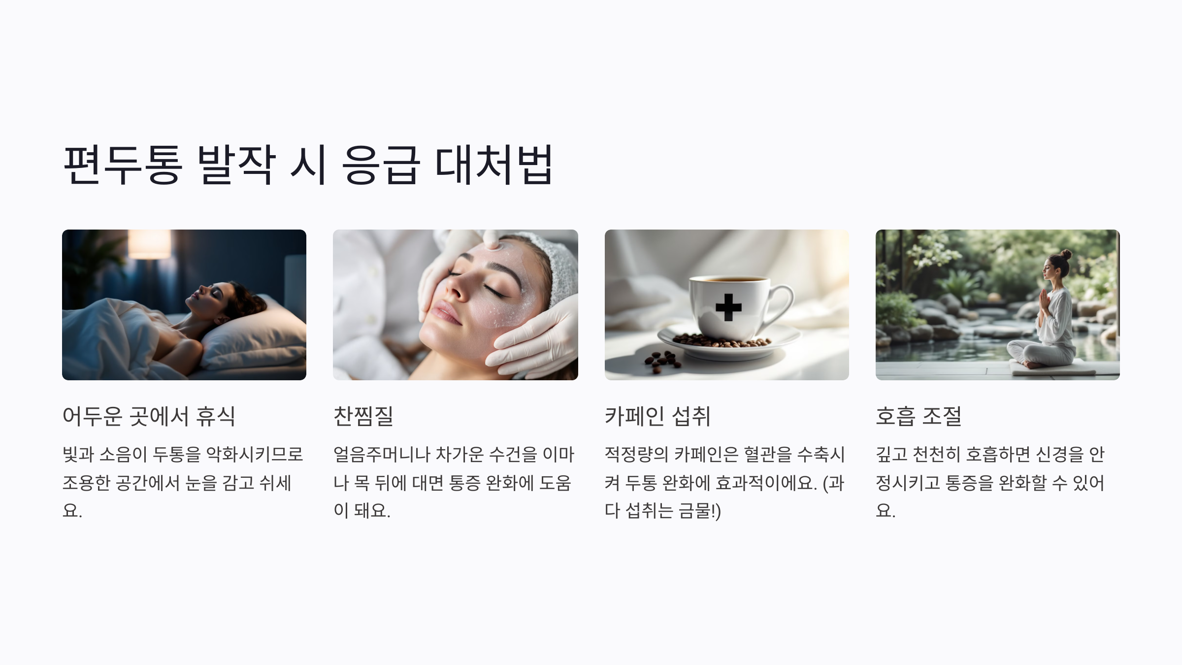 | 카페인 섭취 | 적정량의 카페인은 혈관을 수축시켜 두통 완화에 효과적이에요. (하지만 과다 섭취는 금물!) |