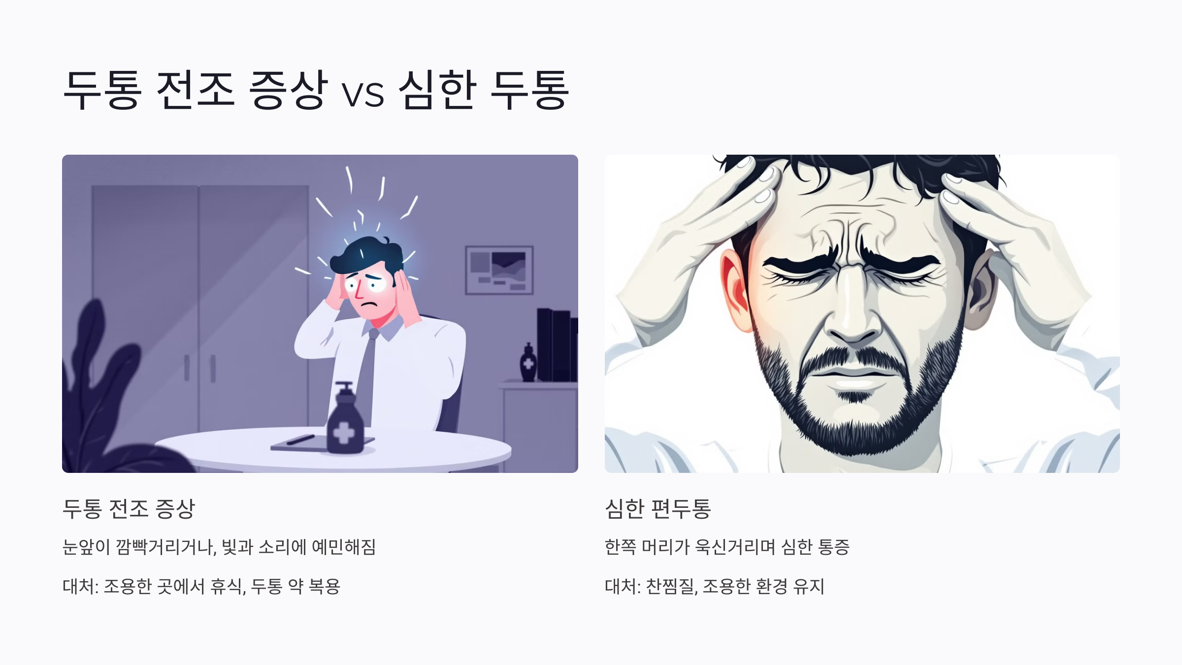 | 두통 전조 증상 | 눈앞이 깜빡거리거나, 빛과 소리에 예민해짐 | 조용한 곳에서 휴식, 두통 약 복용 |