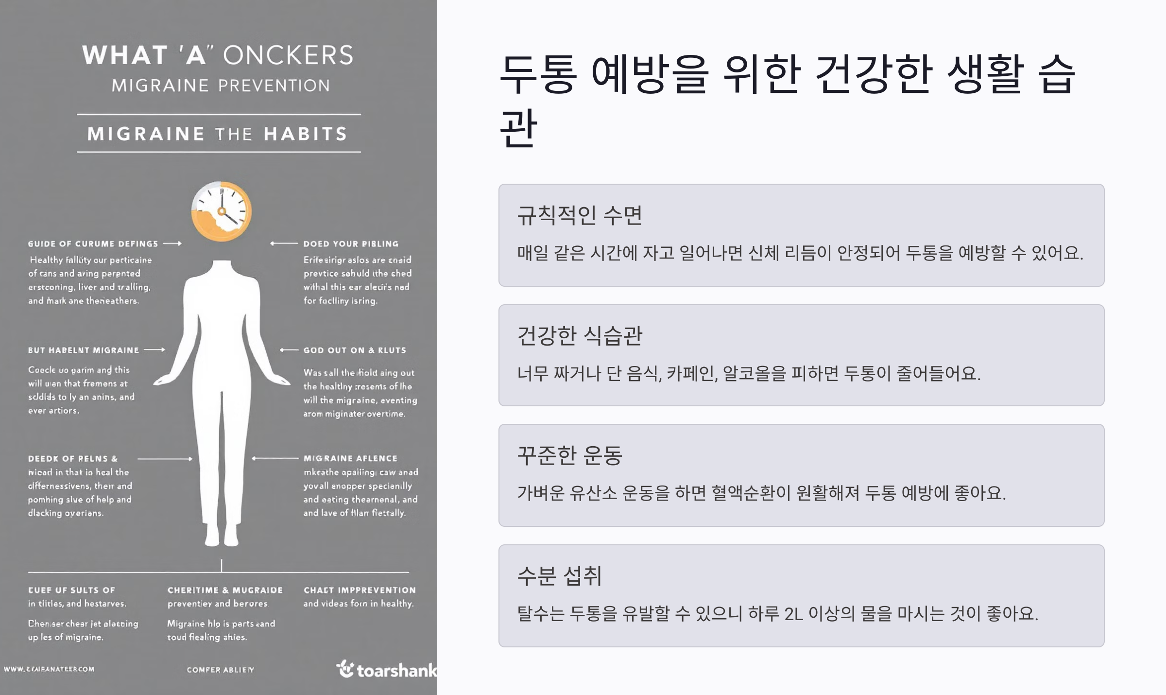 | 규칙적인 수면 | 매일 같은 시간에 자고 일어나면 신체 리듬이 안정되어 두통을 예방할 수 있어요. |