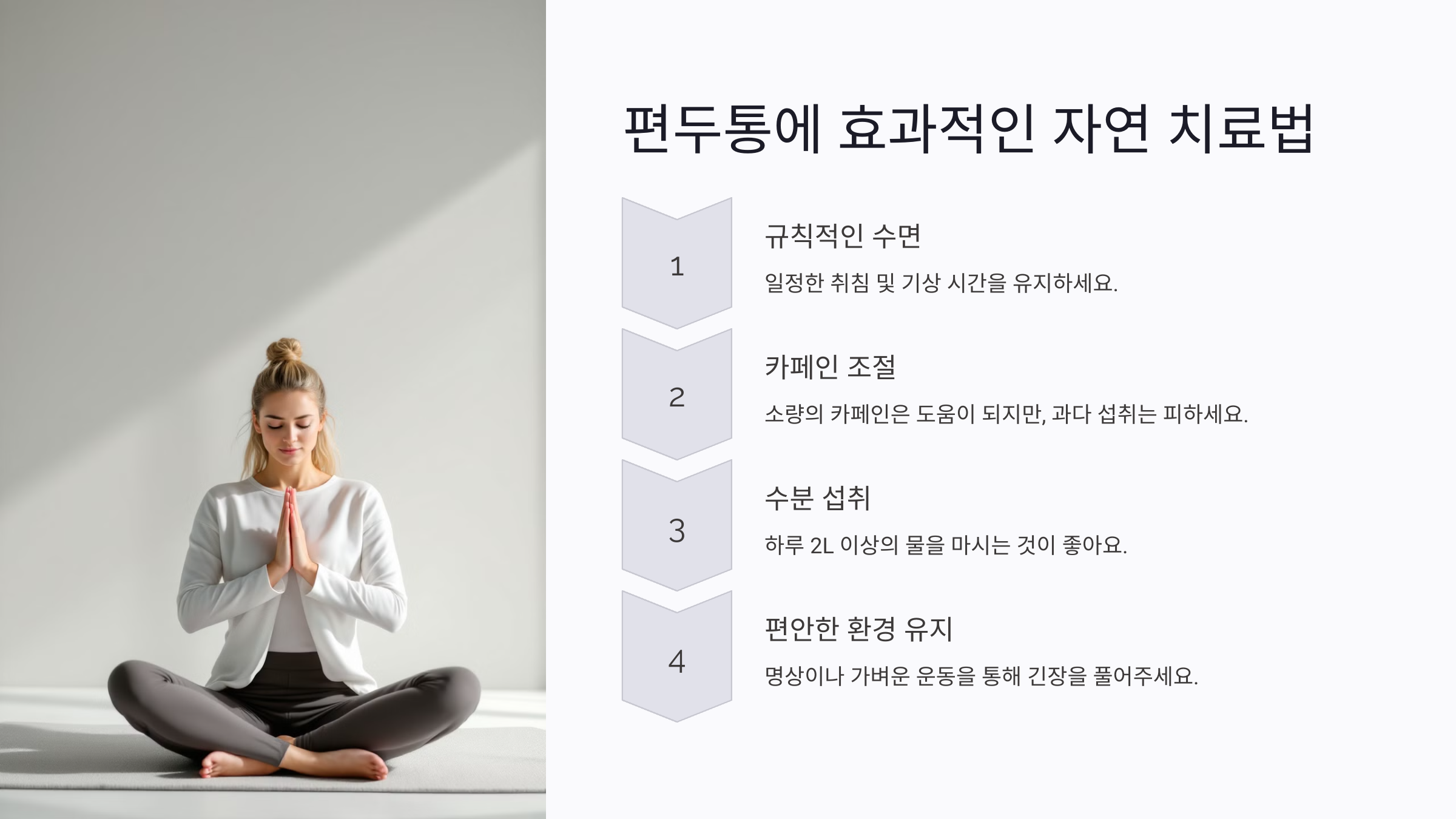 - 편안한 환경 유지: 스트레스가 두통의 주요 원인이므로 명상이나 가벼운 운동을 통해 긴장을 풀어주세요.