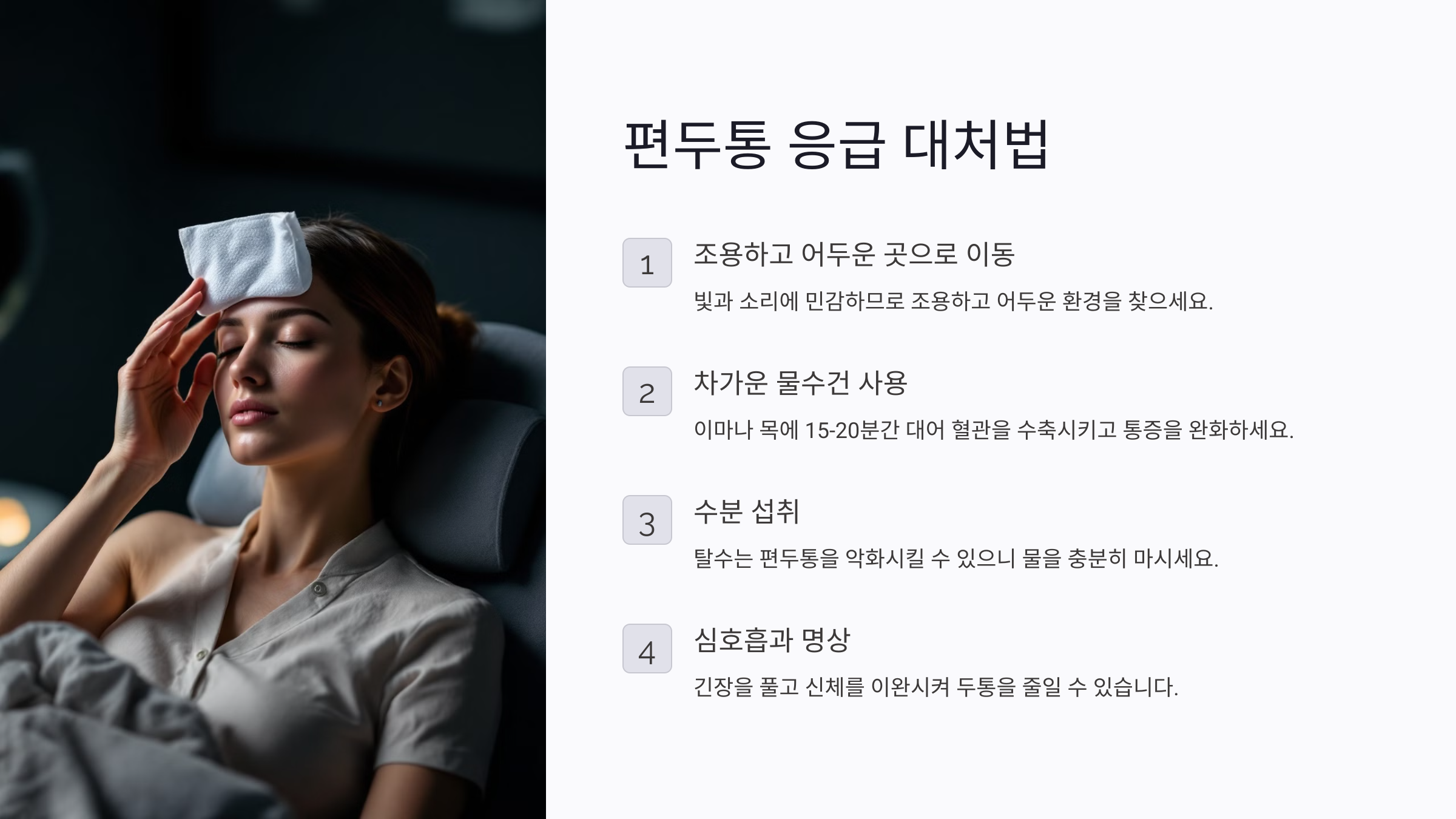 편두통이 시작되면 빠르게 대처하는 것이 중요해요. 초기에 적절한 조치를 취하면 통증을 줄이고, 두통이 더 심해지는 것을 막을 수 있답니다.