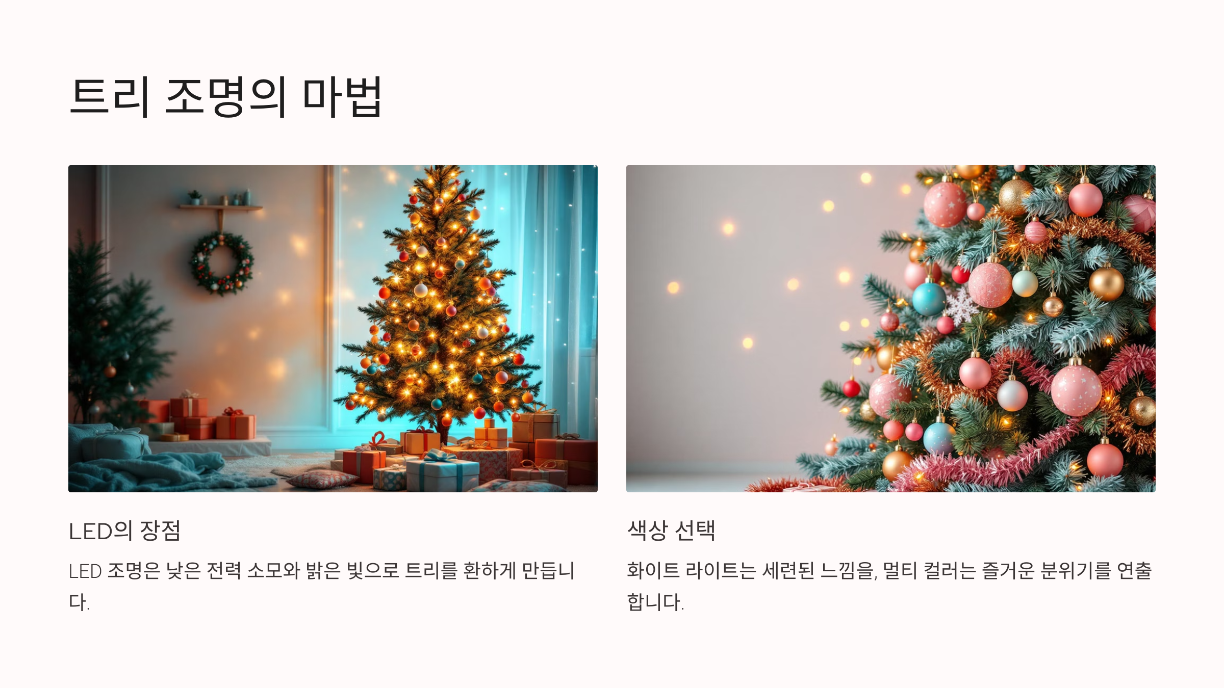 A: 전체적인 인테리어와 어울리는 색상이나 크리스마스 전통 색상(레드, 골드, 그린)을 선택하세요.