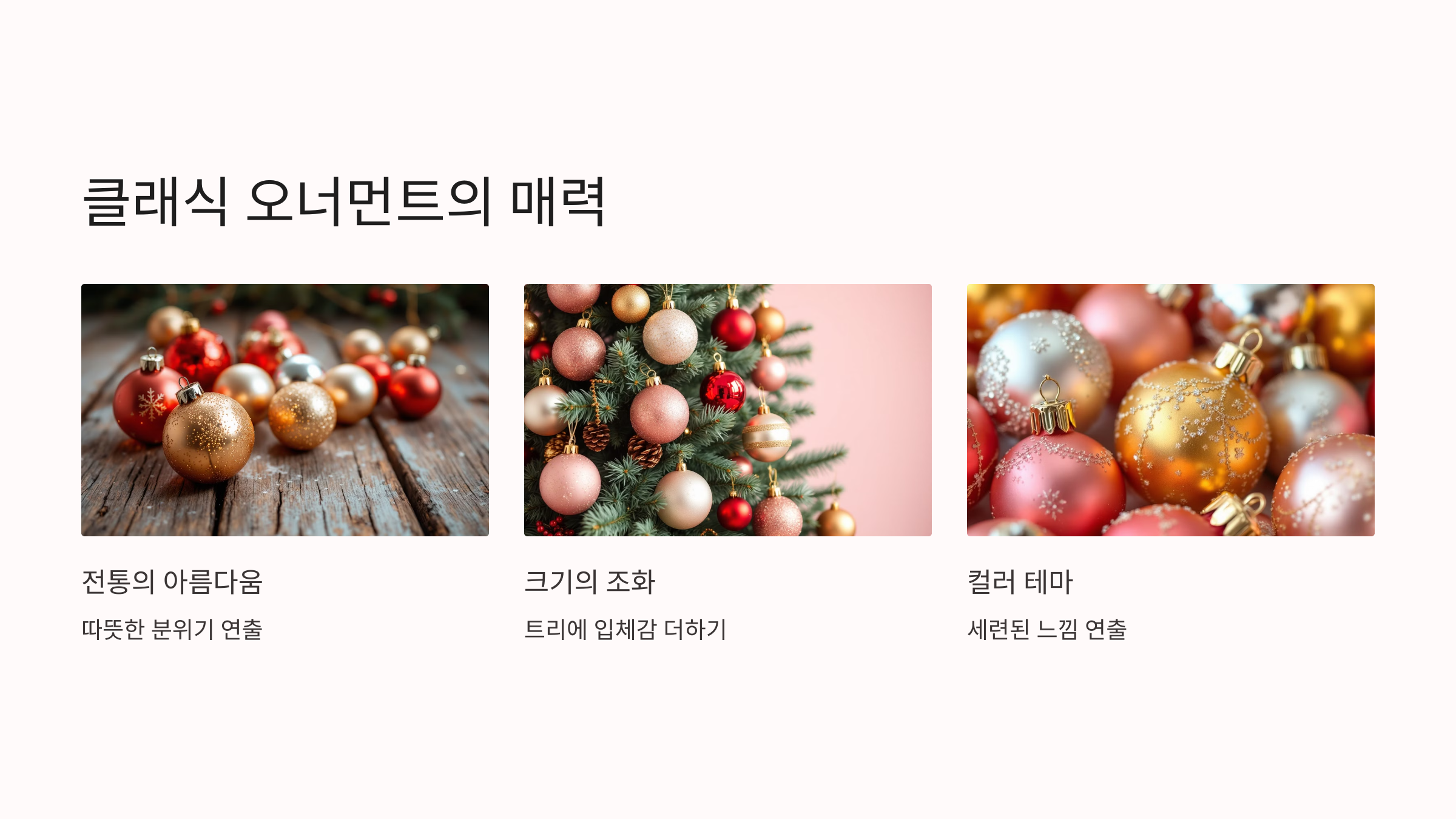 다양한 크기의 오너먼트를 조화롭게 배치하면 입체감이 살아납니다.