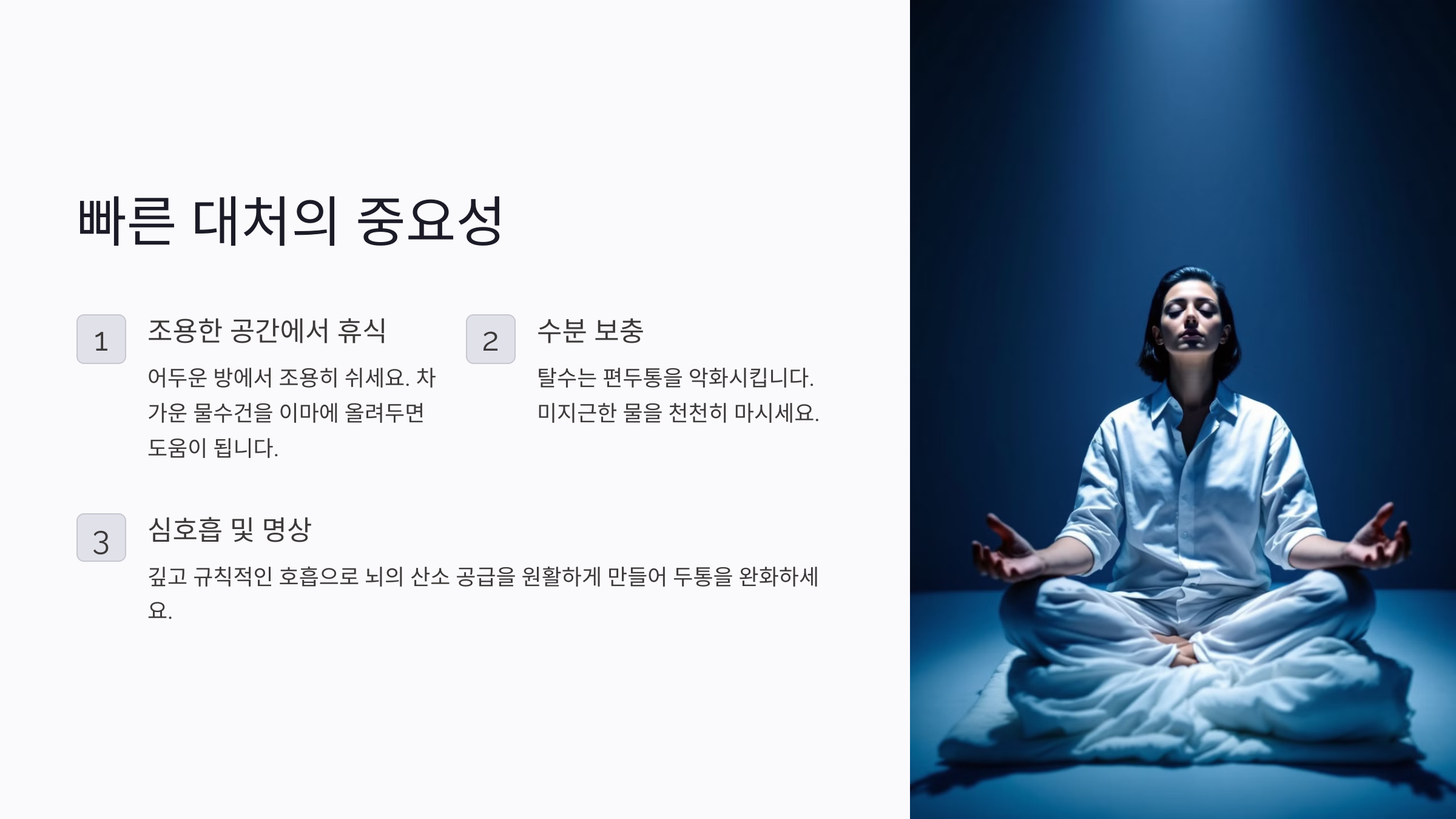 탈수는 편두통을 악화시키는 주요 원인 중 하나예요. 편두통이 시작될 것 같다면 물을 충분히 마셔야 해요. 특히 카페인이나 알코올 섭취를 줄이고, 미지근한 물을 천천히 마시는 것이 도움이 돼요.