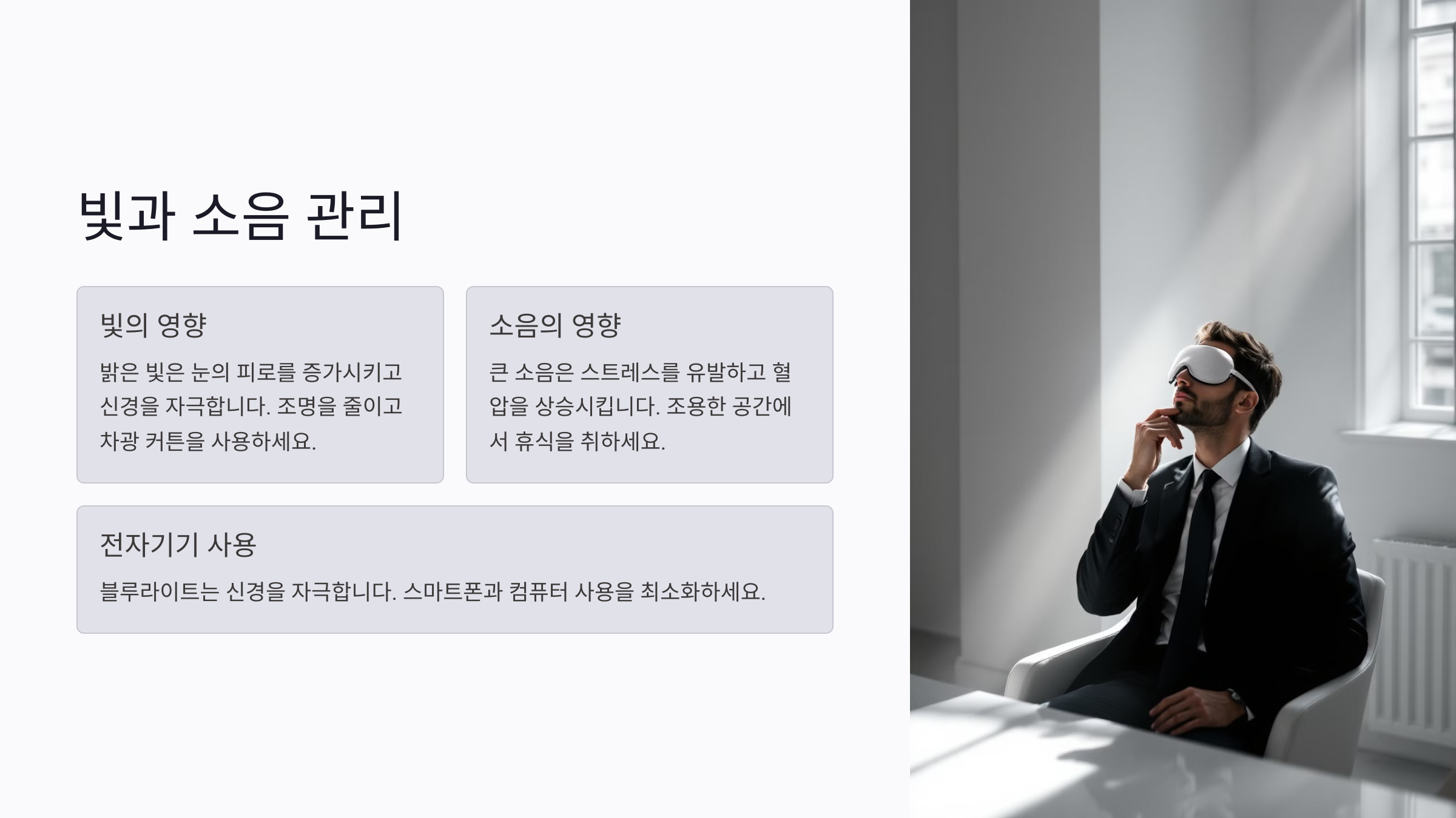 | 밝은 빛 | 눈 피로 증가, 신경 자극 | 차광 커튼 사용, 블루라이트 차단 |