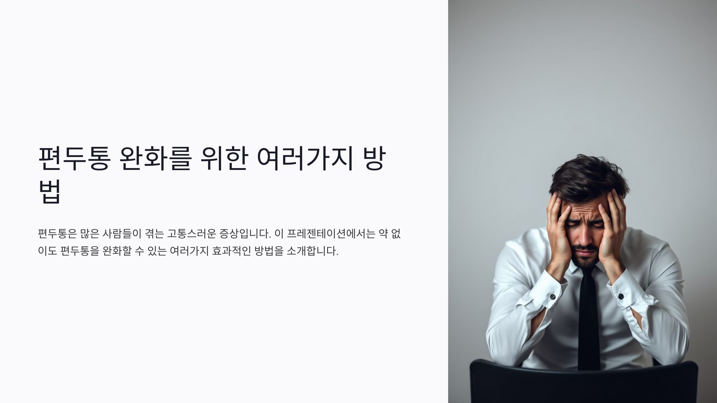 📋 목차편두통이 올 때 바로 해야 할 일약 없이 두통 완화하는 자연 요법식단 조절로 편두통 예방하는 법스트레칭과 마사지로 두통 줄이기수면 습관을 바꾸면 두통이 줄어든다?두통 예방을 위