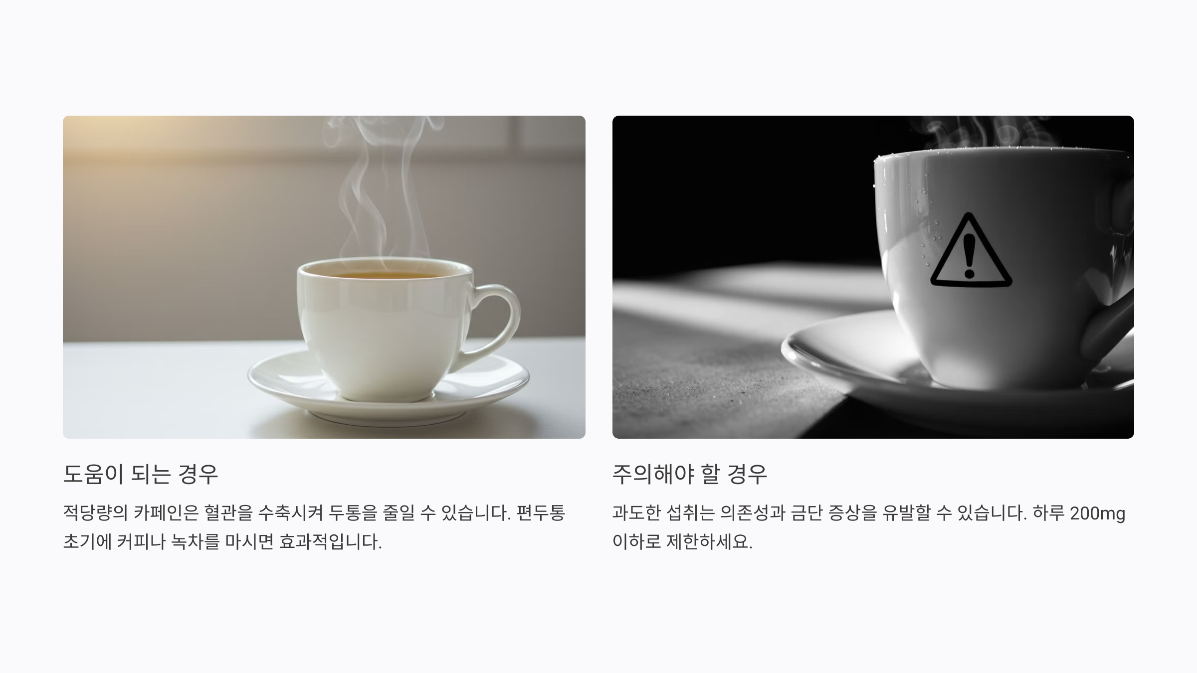 | 적당량 (200mg 이하) | 혈관 수축 효과로 두통 완화 | ⭕ 추천 |