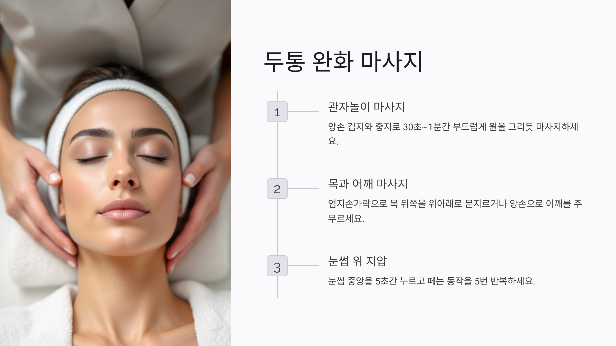 편두통이 찾아왔을 때 간단한 마사지만으로도 통증을 완화할 수 있어요. 손가락을 이용해 특정 지점을 자극하면 혈액순환이 원활해지고, 뇌로 가는 산소 공급이 증가하면서 두통이 줄어드는 효과가 있어요.