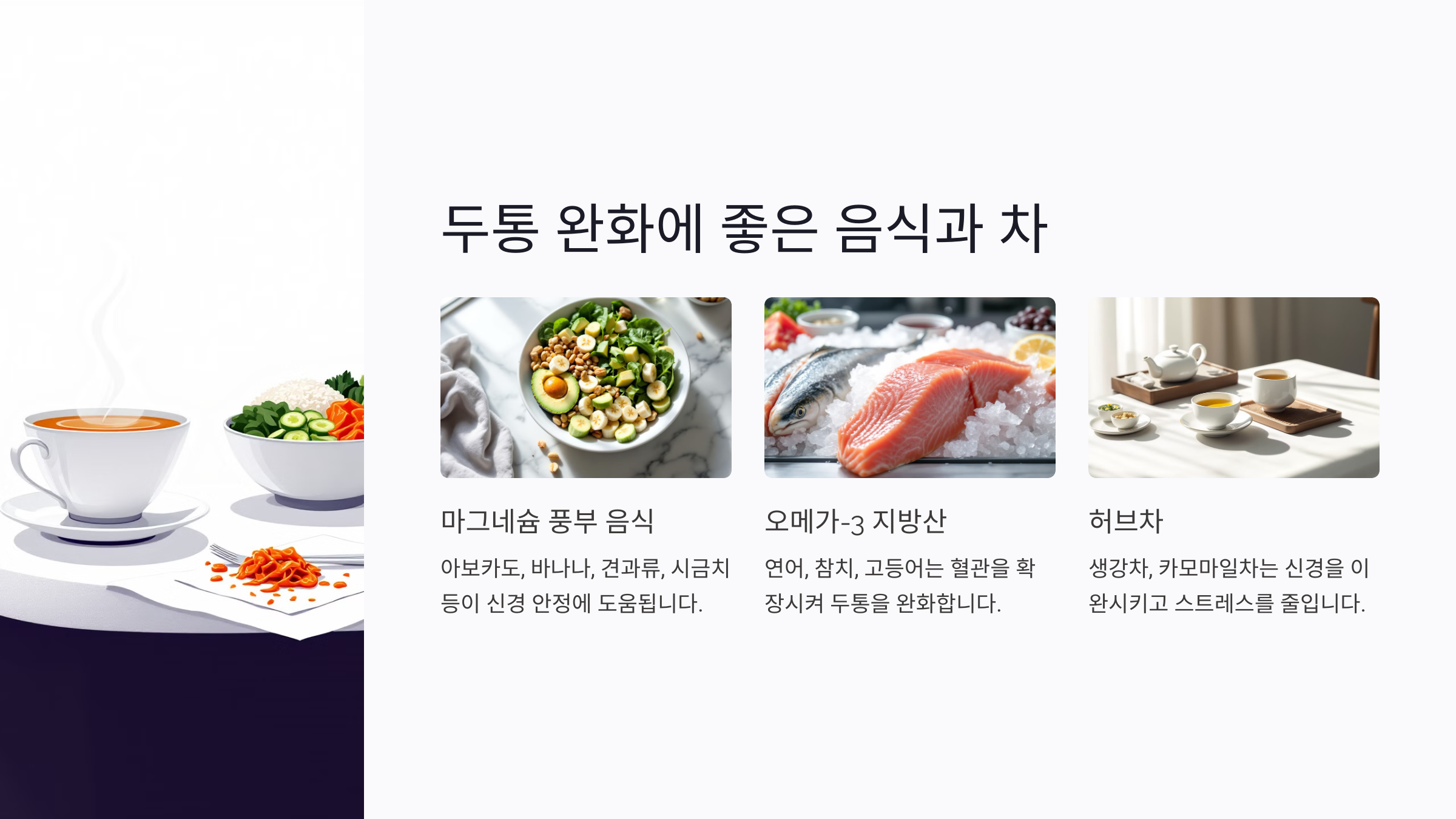 음식이 편두통을 완화하는 데 도움이 될 수 있다는 사실, 알고 계셨나요? 특정 음식과 차는 혈액순환을 돕고 신경을 안정시켜 두통을 줄이는 효과가 있어요. 특히 편두통을 자주 겪는다면 평소 식단을 신경 써보는 것도 좋은 방법이에요! 😊