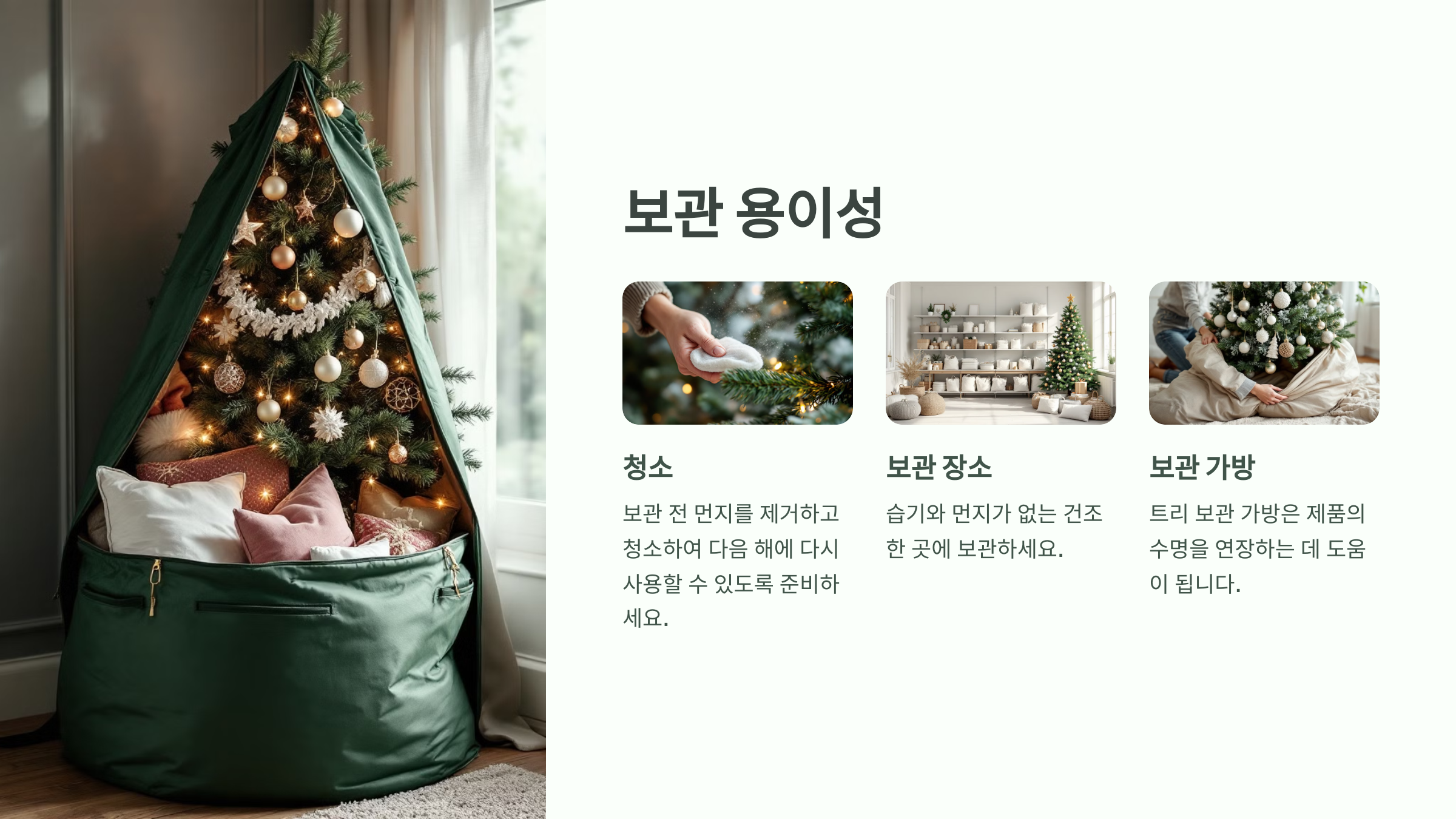 접이식, 벽걸이형, 테이블형 등 다양한 형태의 트리를 고려해보세요.