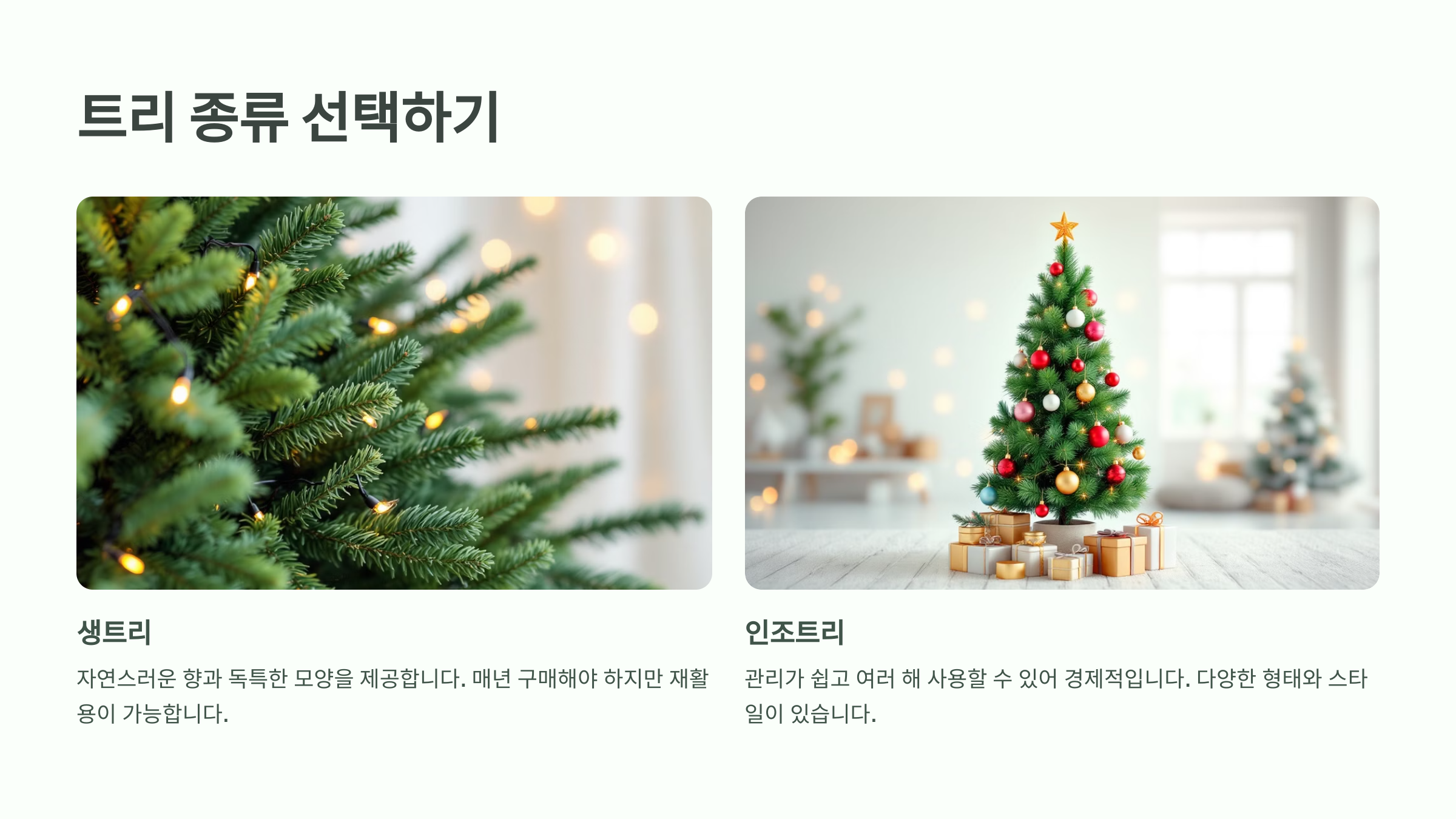 A: 생트리는 자연스러운 향과 독특한 외관을 제공하며, 인조트리는 경제적이고 관리가 용이합니다. 필요와 취향에 따라 선택하세요.