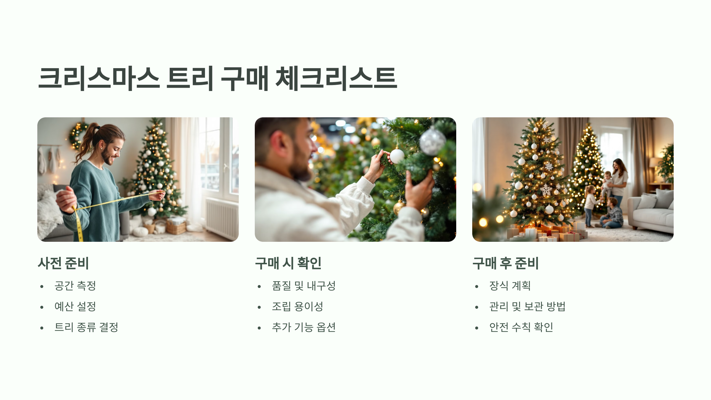 크리스마스 트리를 구매하기 전에 고려해야 할 중요한 요소들이 있습니다. 트리의 종류, 크기, 소재, 그리고 예산까지 꼼꼼히 확인하고 적합한 트리를 선택하세요.