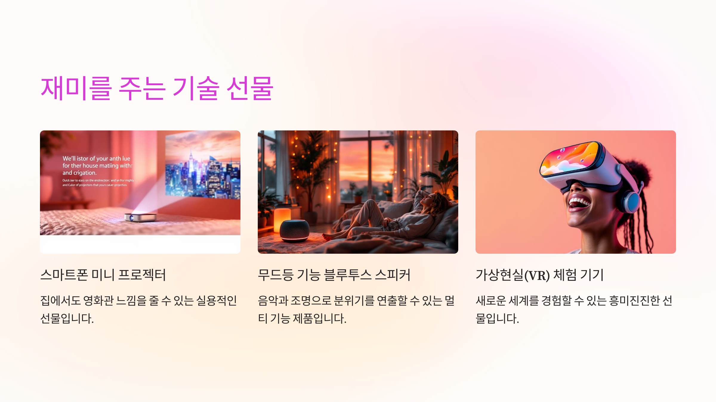 A: VR 기기, 스마트 홈 디바이스, 미니 프로젝터가 좋습니다.