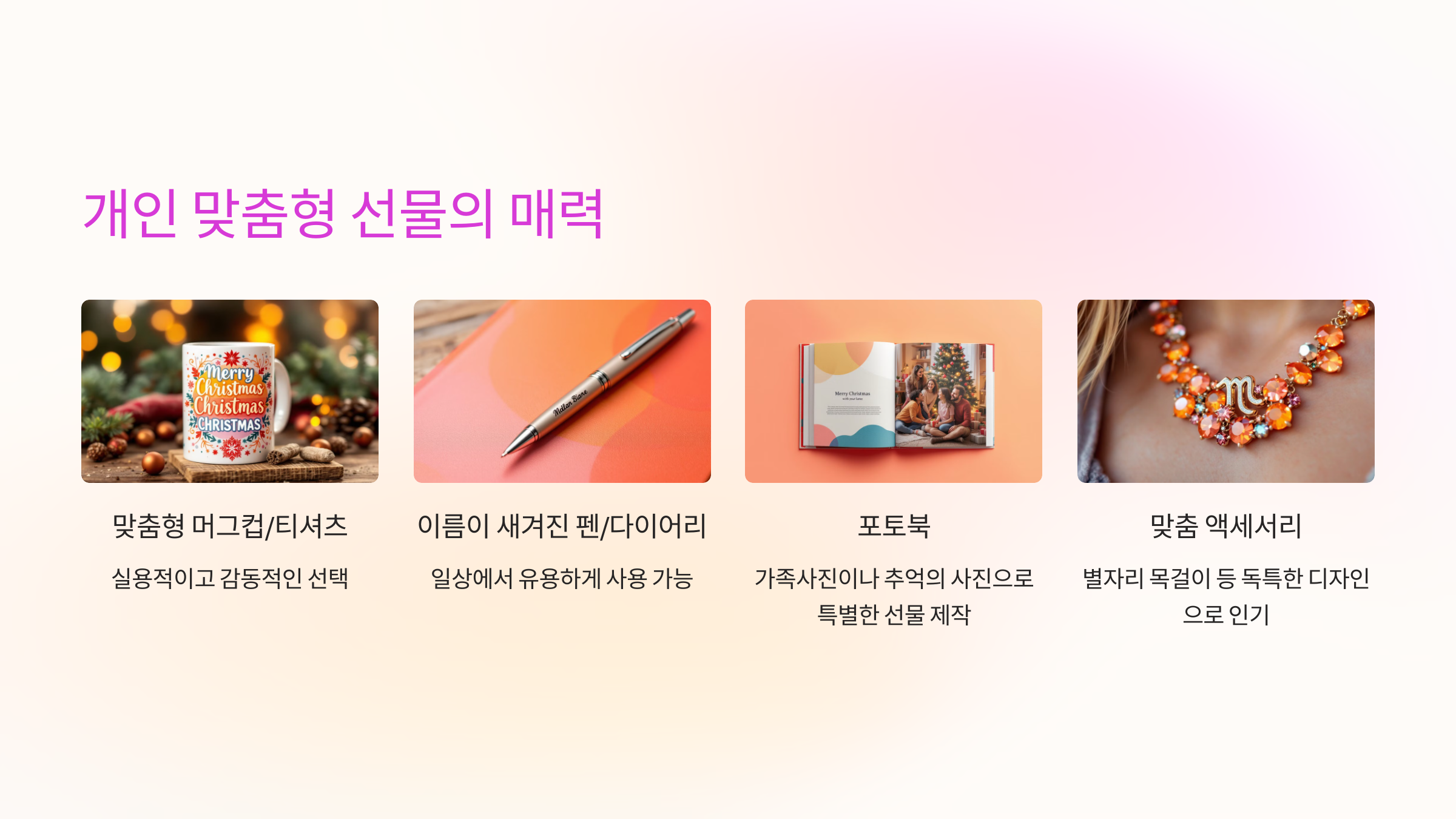 개인 맞춤형 선물은 받는 사람의 취향과 개성을 반영해 특별함을 더합니다.