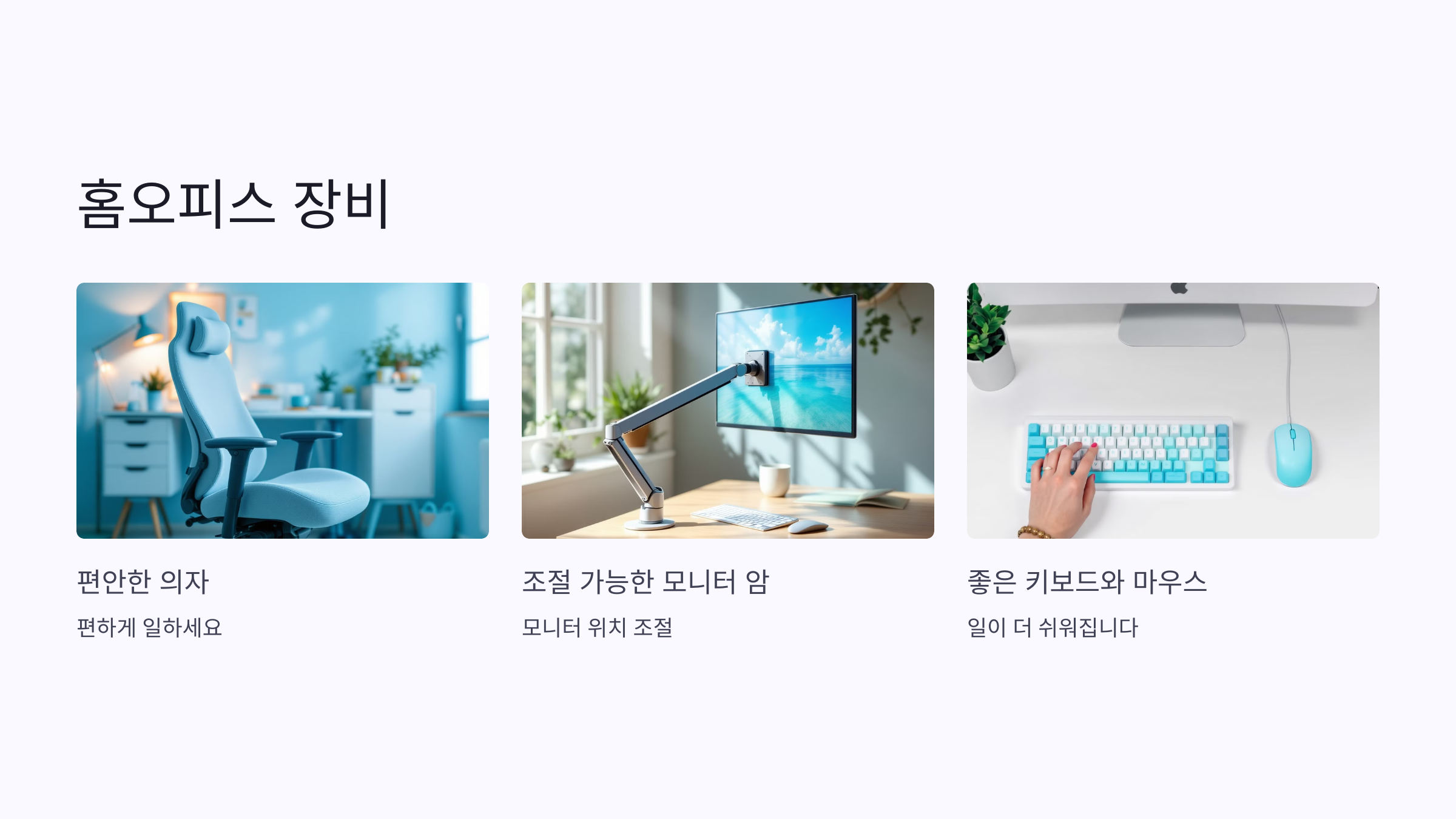 A: 인체공학적 의자, 모니터 암, 고급 키보드 등을 추천합니다.