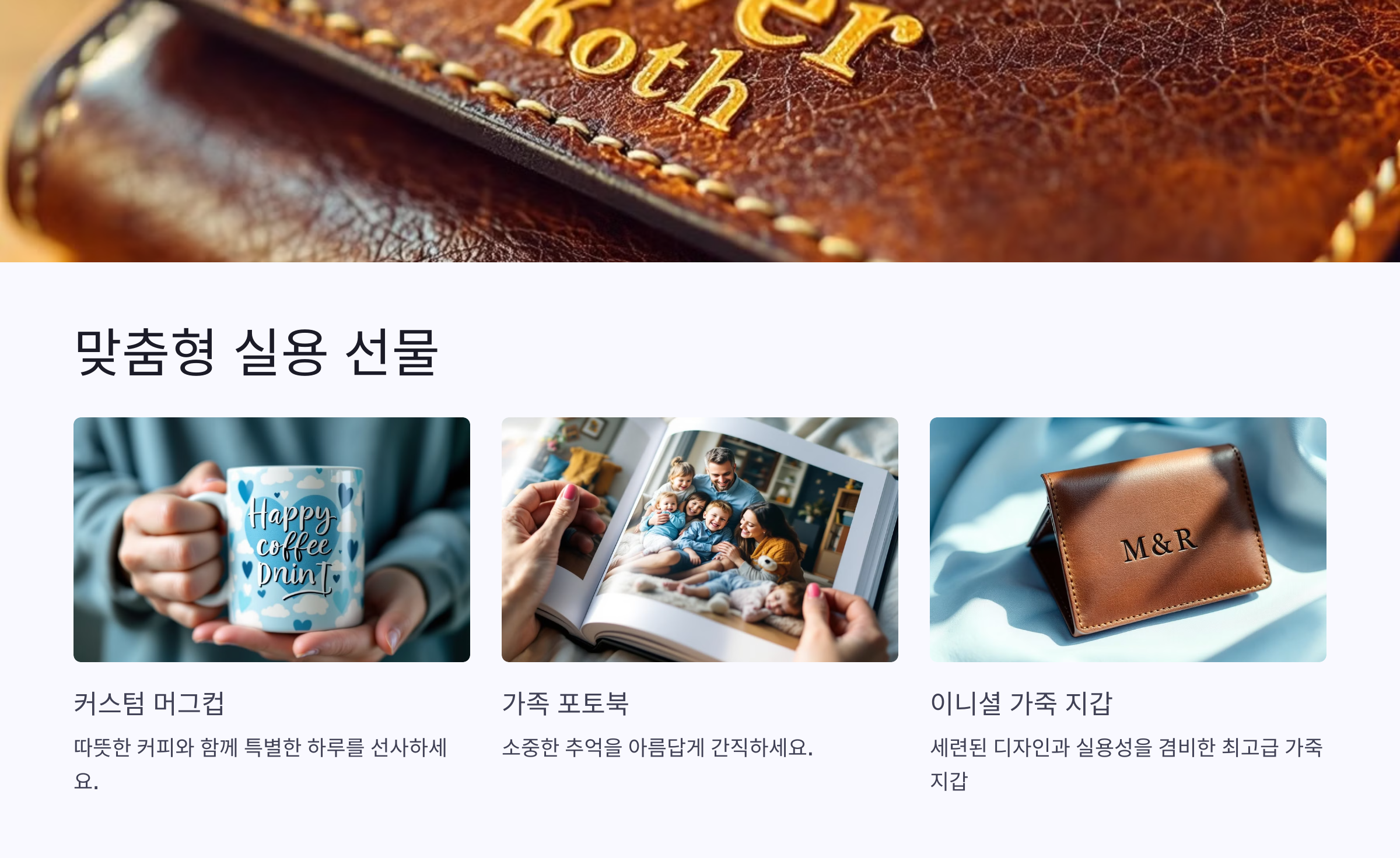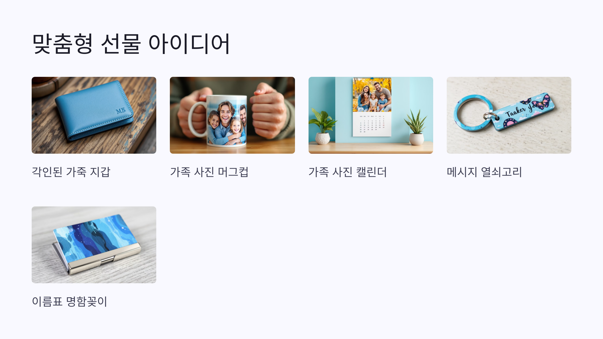 A: 이니셜 가죽 지갑, 포토북, 개인화된 캘린더를 추천합니다.