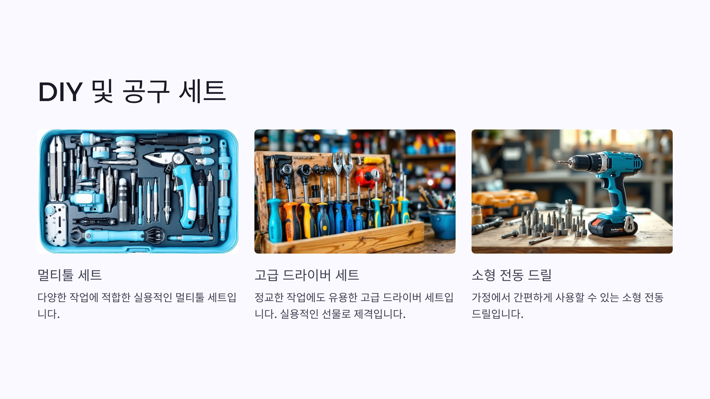 A: 멀티툴 세트, 전동 드릴, 공구 보관함이 좋은 선택입니다.