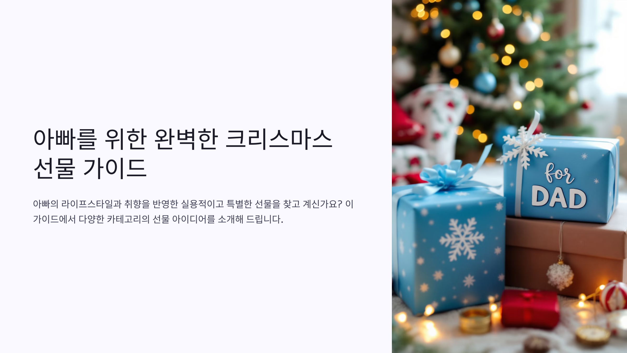 아빠를 위한 크리스마스 선물은 실용적이면서도 그의 라이프스타일과 취향을 반영한 것이 좋습니다. 아래에는 다양한 카테고리에서 아빠가 기뻐할 선물을 추천하니 참고하세요.