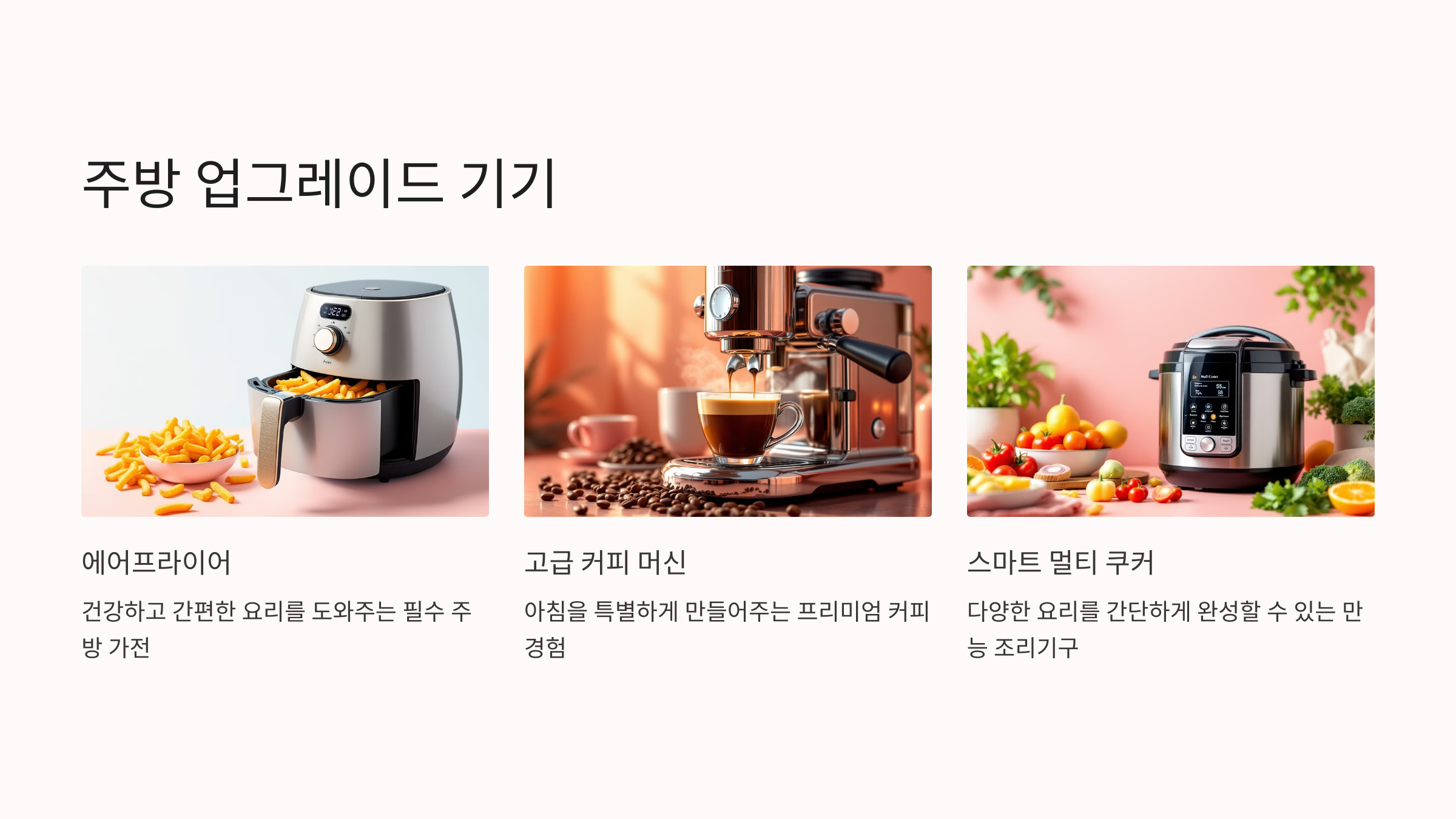 A: 에어프라이어, 멀티 쿠커, 고급 커피 머신을 추천합니다.