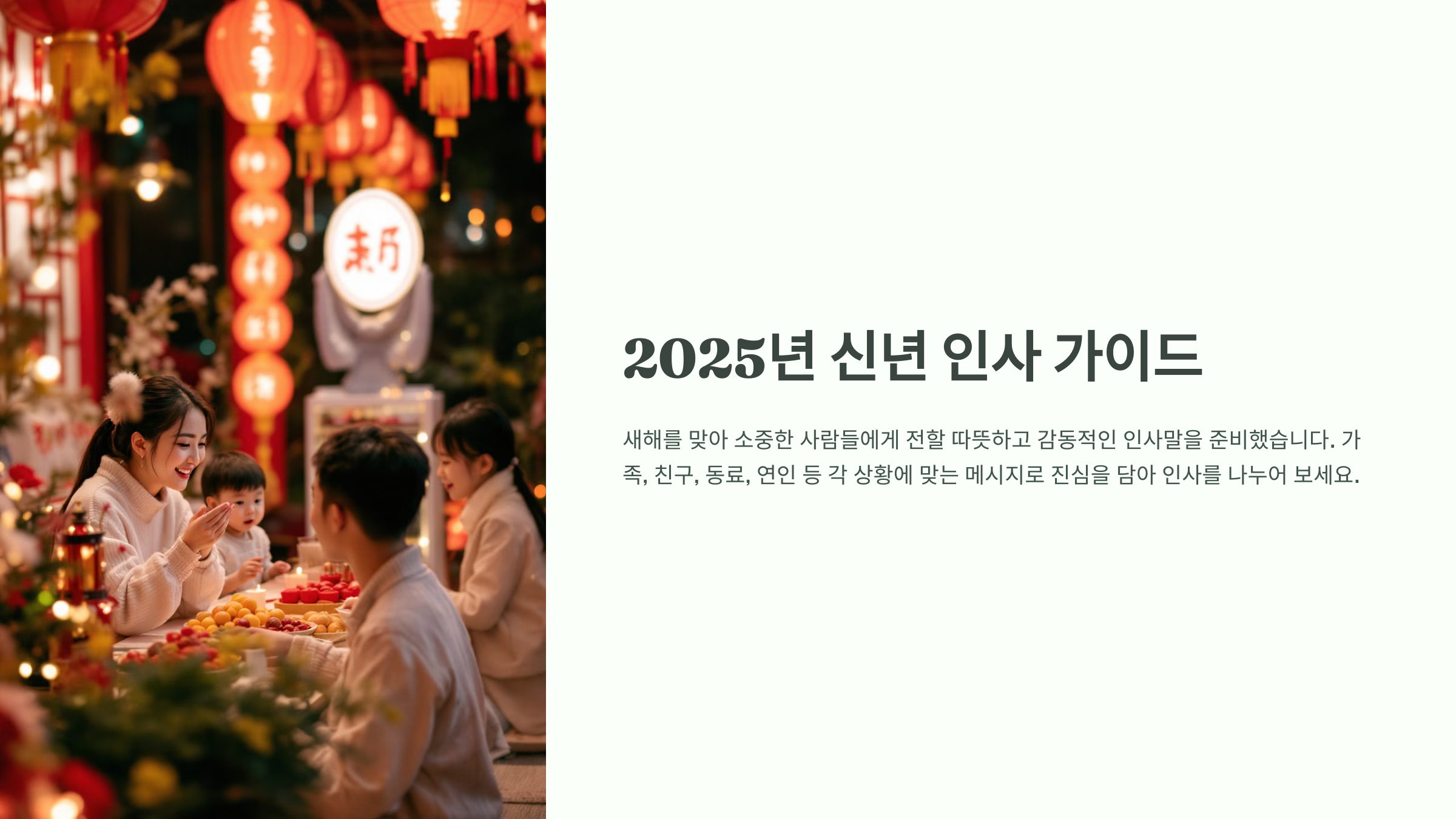 2025년 새해가 밝았습니다. 새 출발을 축하하며 소중한 사람들에게 전할 따뜻하고 감동적인 신년 인사말을 준비했습니다. 각 상황에 맞는 메시지로 진심을 담아 인사를 나누어 보세요.
