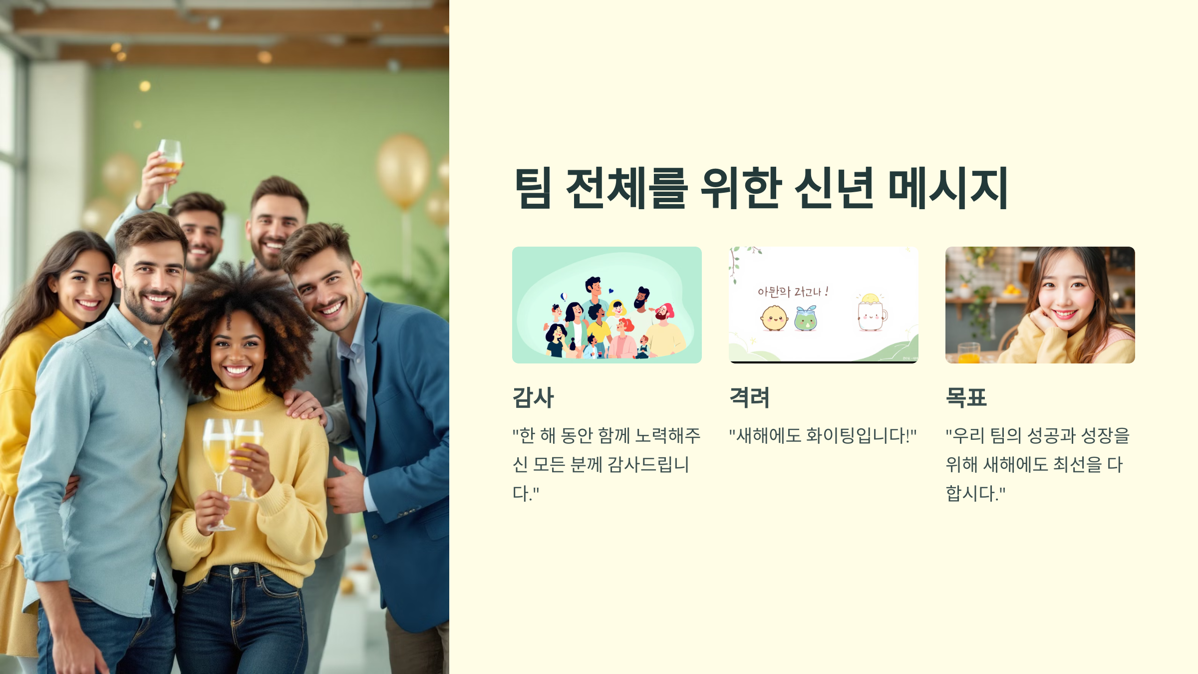 “우리 팀의 성공과 성장을 위해 새해에도 최선을 다합시다. 복 많이 받으세요!”