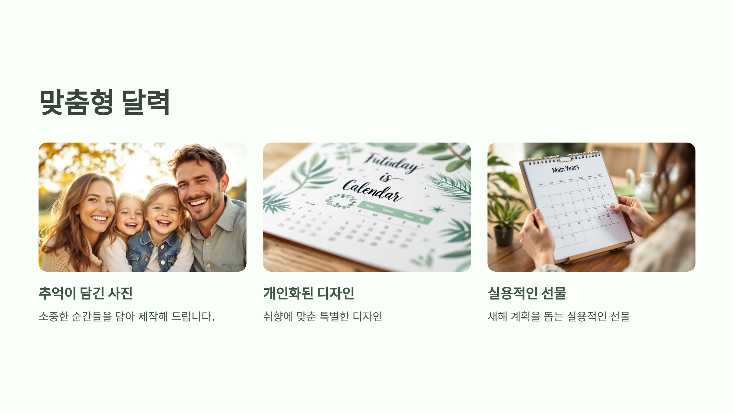 사랑하는 사람들과의 추억이 담긴 사진들로 구성된 맞춤형 달력은 언제나 감동을 줍니다.