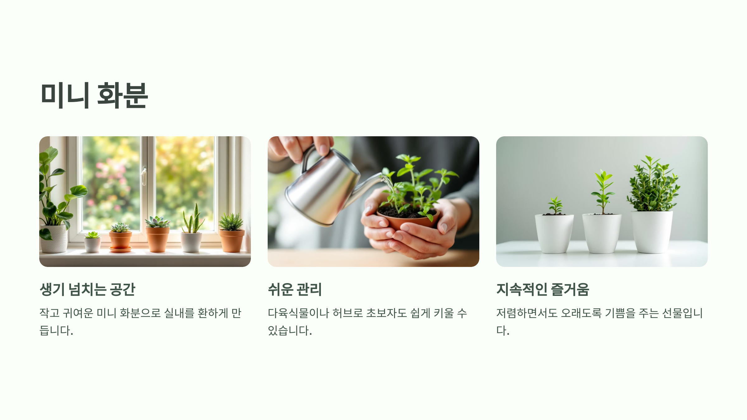 작고 귀여운 미니 화분은 실내 공간을 생기있게 만듭니다.