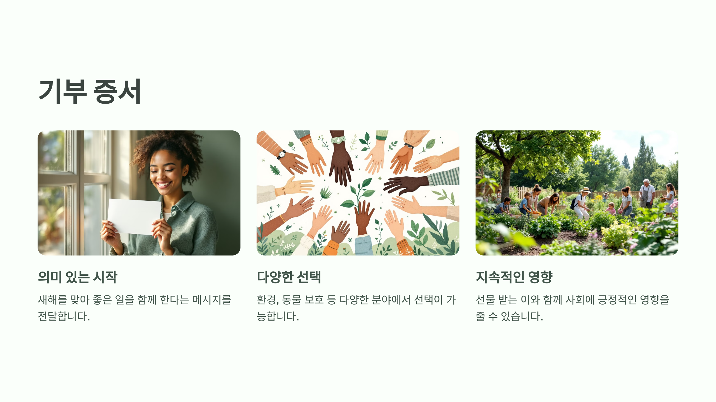 A: 기부 증서는 새해를 맞아 의미를 담은 선물로 적합합니다.