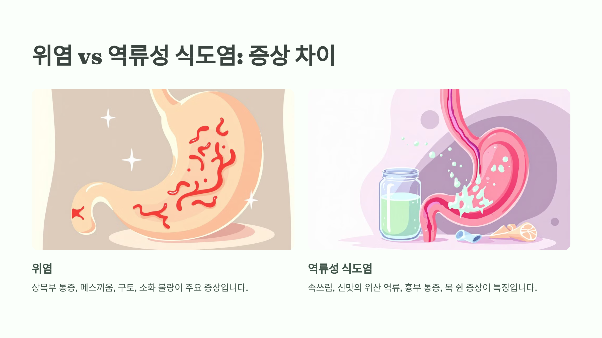 A: 위염은 상복부 통증과 메스꺼움, 역류성 식도염은 속쓰림과 흉부 통증이 주 증상입니다.