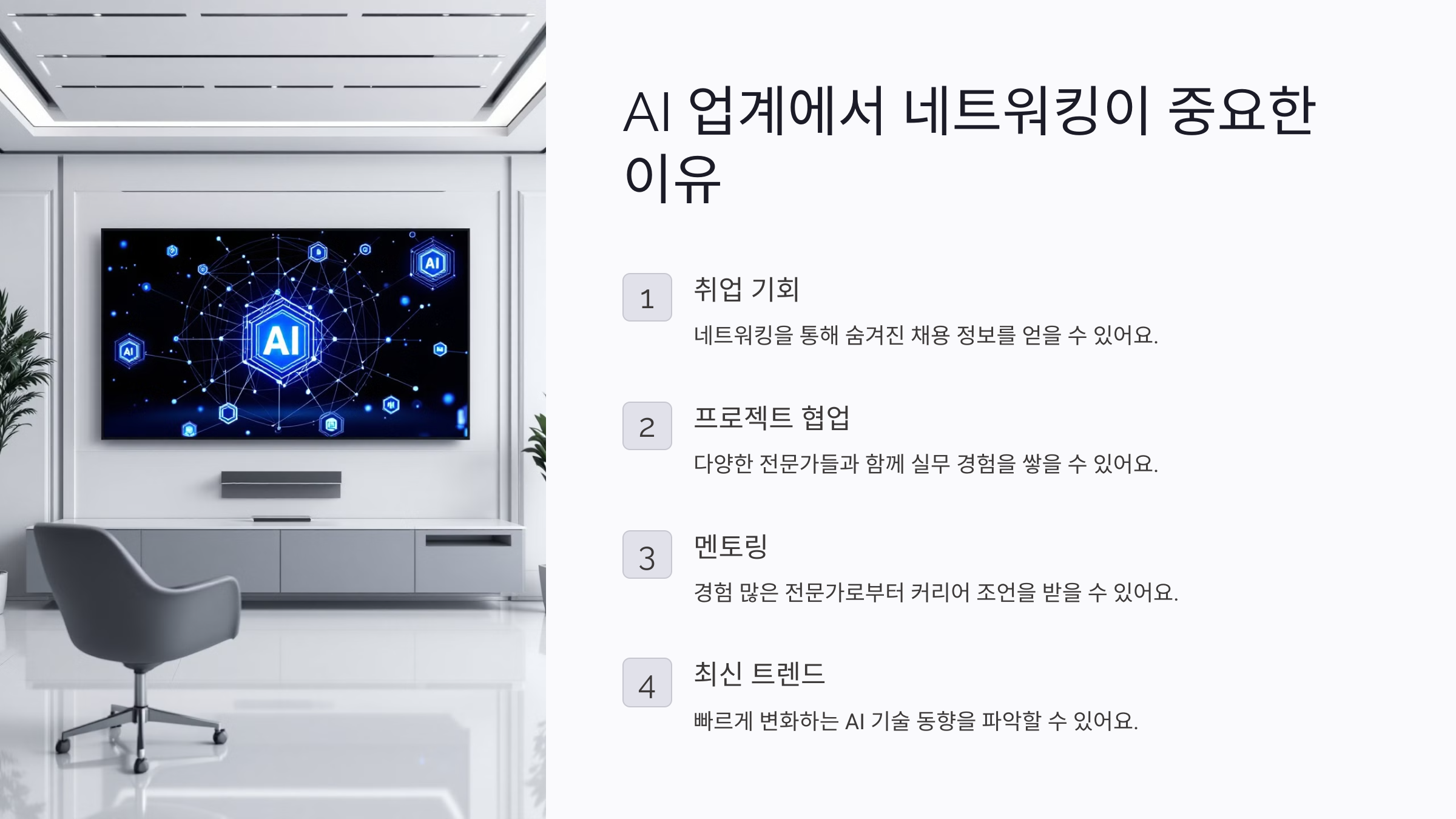 AI 업계는 빠르게 변화하는 기술과 함께 성장하는 분야예요. 새로운 연구, 도구, 그리고 채용 기회가 지속적으로 등장하기 때문에 업계 인맥을 쌓는 것이 매우 중요해요.