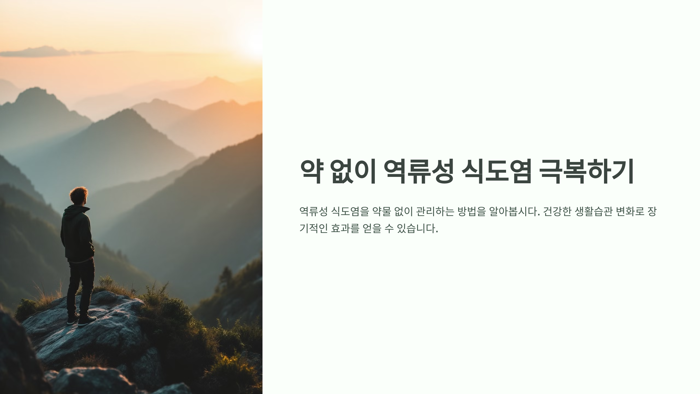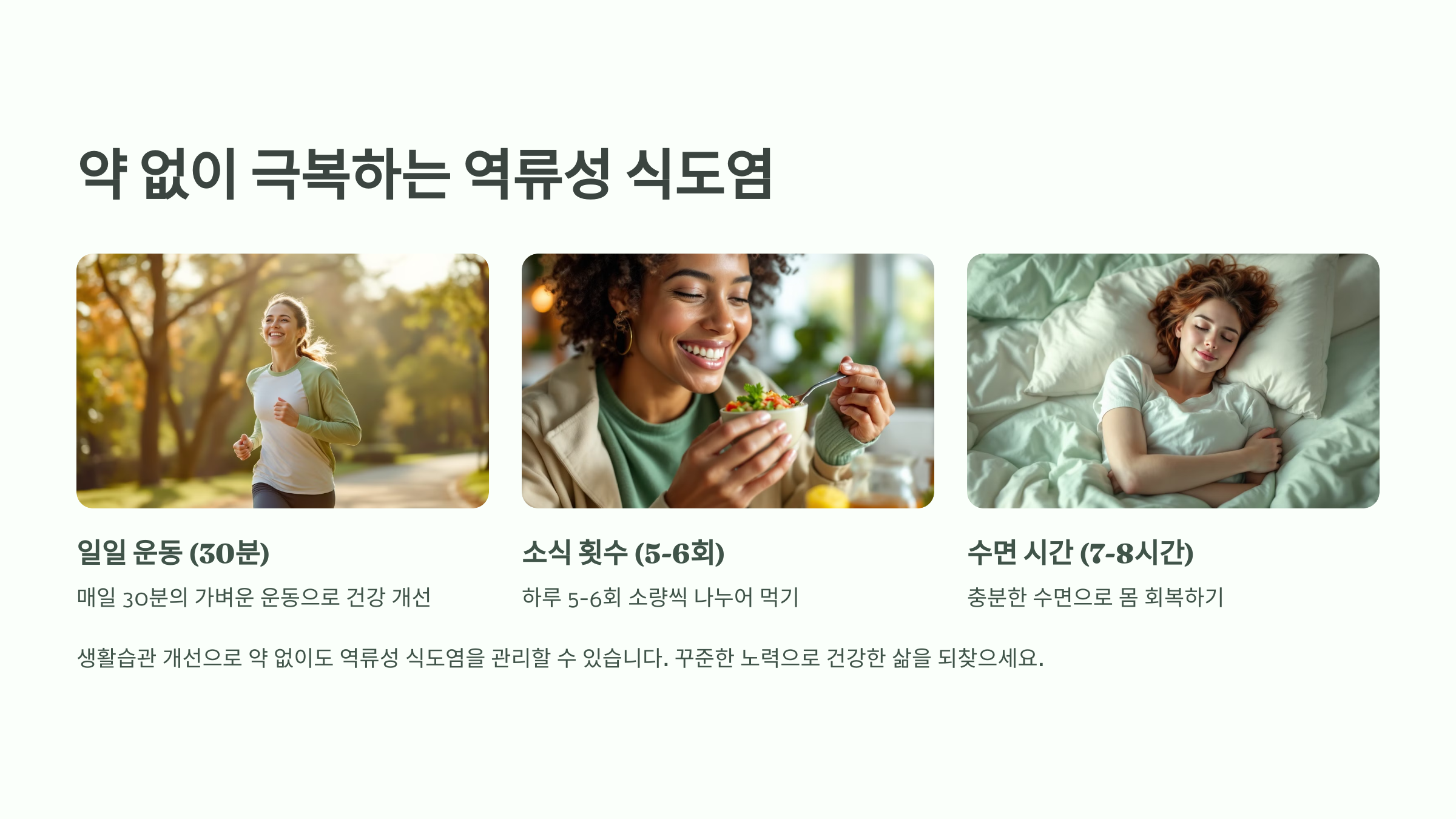 역류성 식도염을 약 없이 극복하려면 생활습관 변화가 핵심입니다. 건강한 식습관, 스트레스 관리, 적절한 운동 등으로 장기적인 효과를 얻을 수 있습니다.