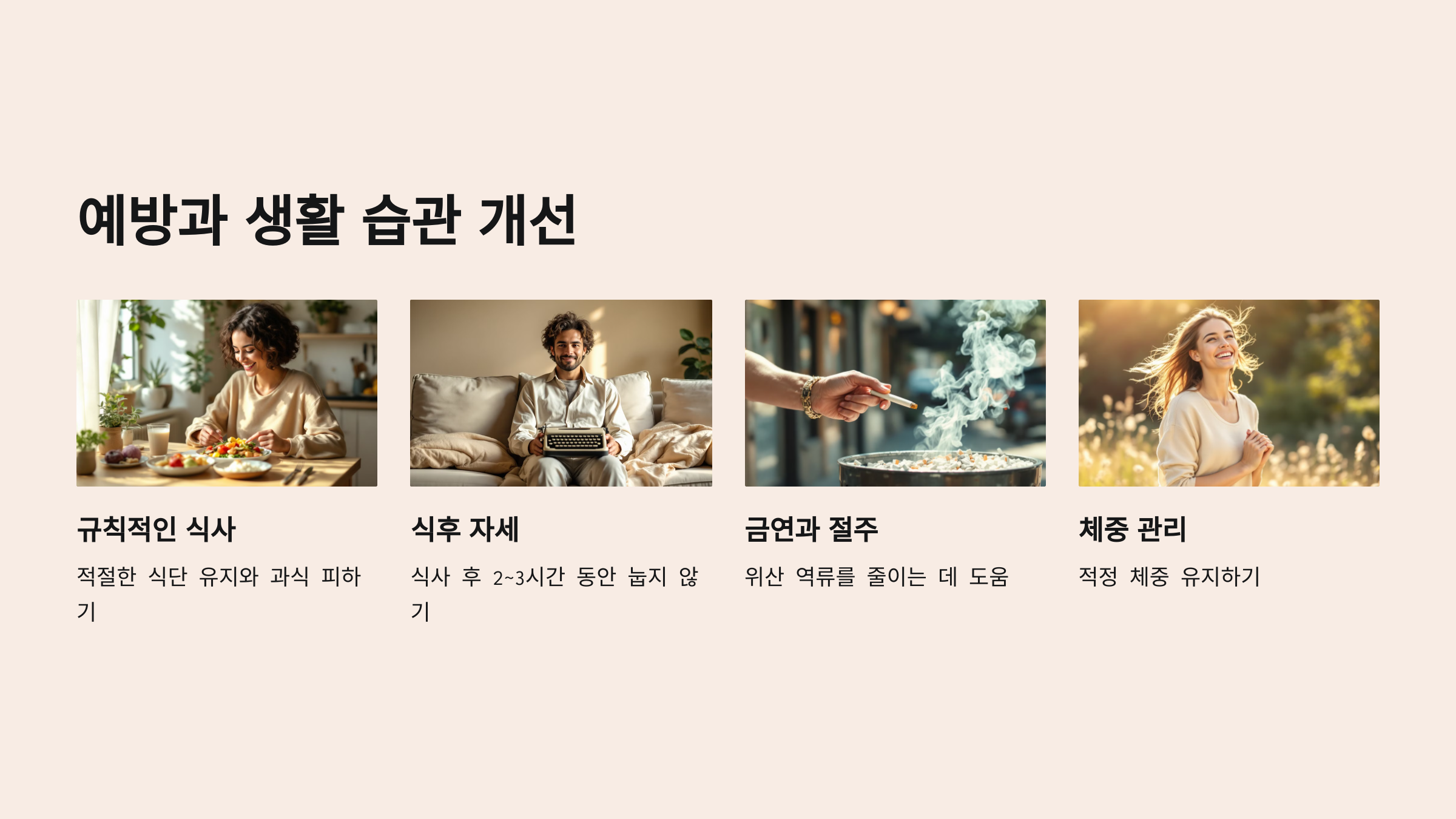 A: 규칙적인 식사, 금연, 체중 관리, 그리고 취침 전 음식 섭취 자제를 추천합니다.