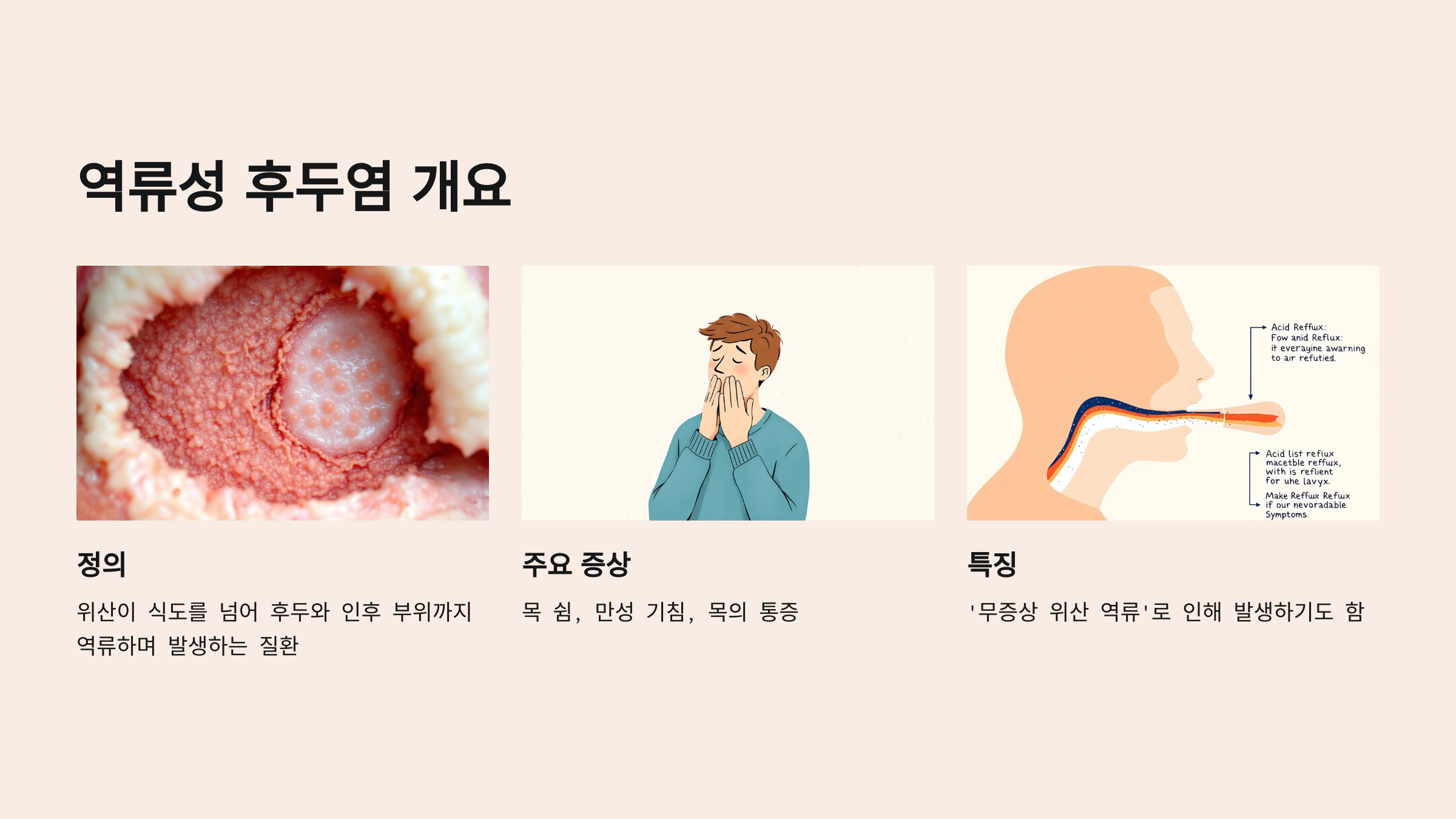 역류성 후두염은 위산이 식도를 넘어 후두와 인후 부위까지 역류하며 발생합니다.