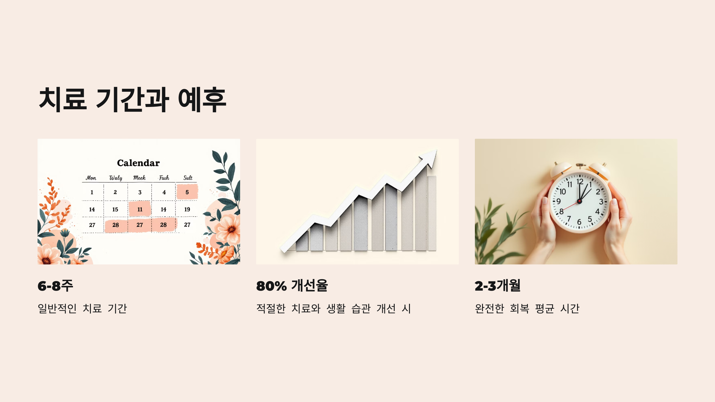 A: 증상의 정도에 따라 다르지만, 일반적으로 6~8주 이상의 치료가 필요합니다.
