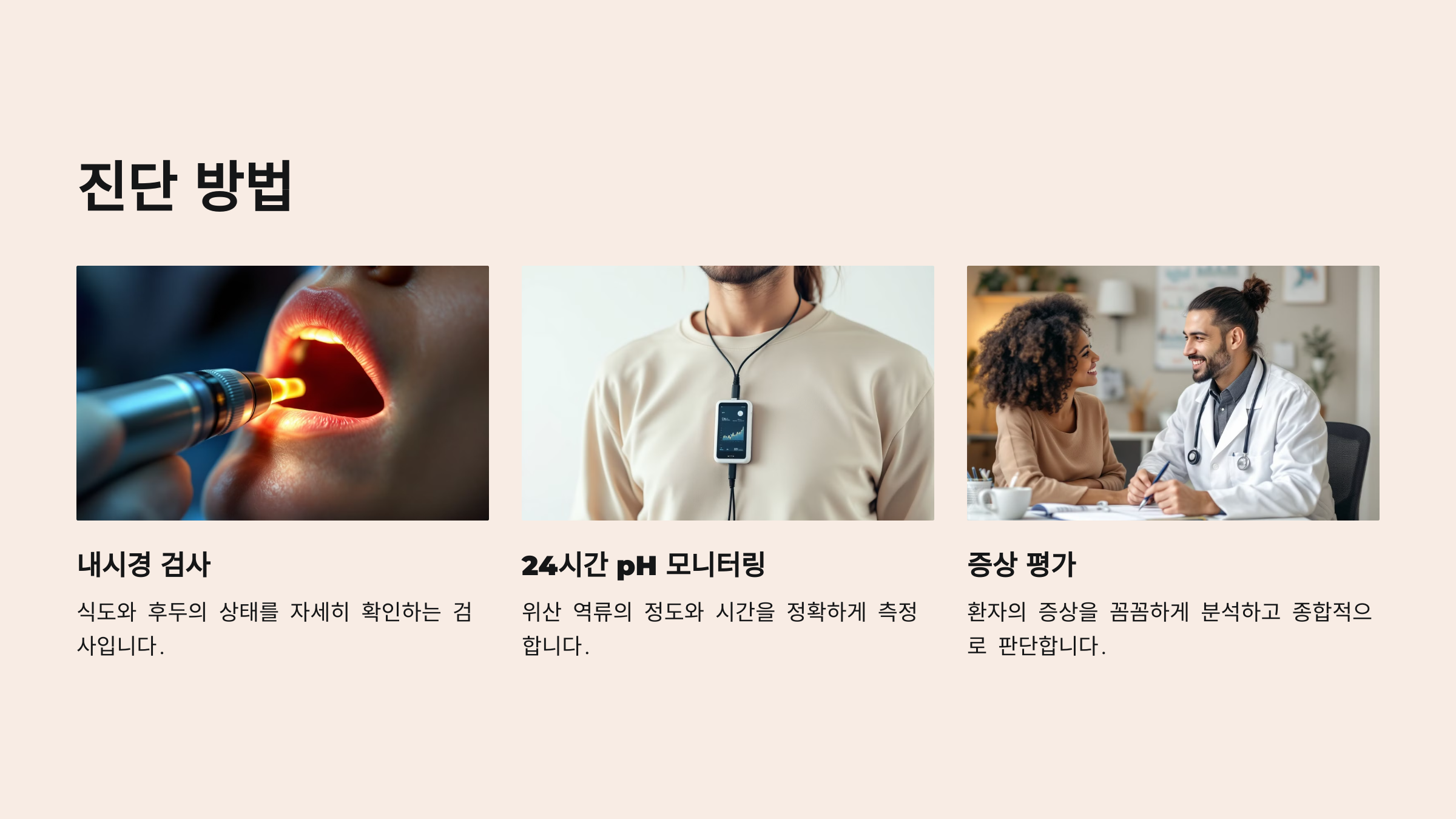 주요 증상으로는 가슴 쓰림, 신트림, 목의 이물감이 포함됩니다.