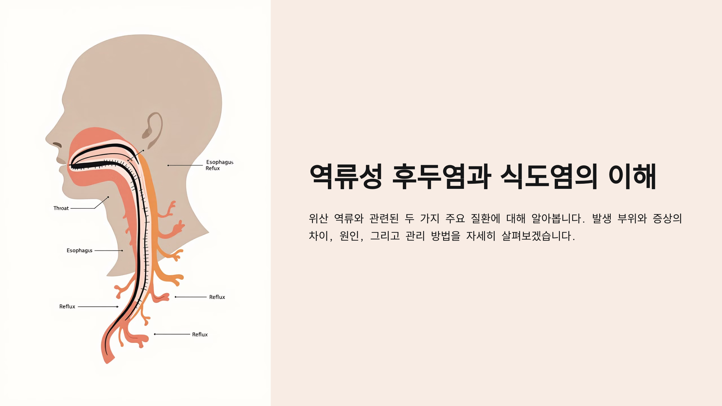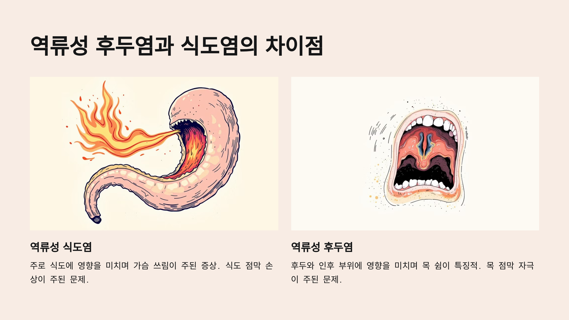 식도염은 식도 점막 손상이 주된 문제이고, 후두염은 목 점막 자극이 문제입니다.