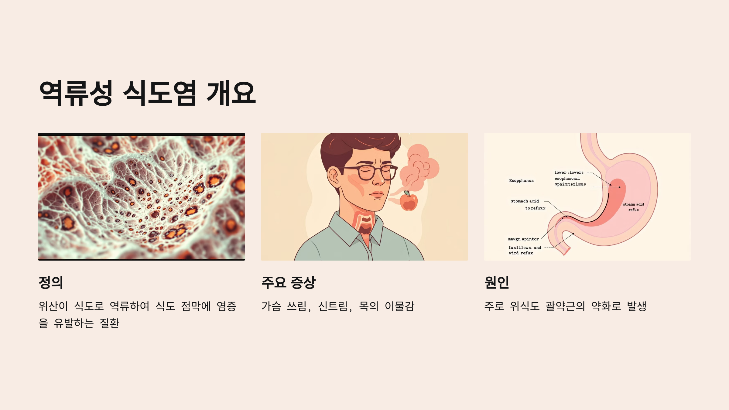 역류성 식도염은 위산이 식도로 역류하면서 식도 점막에 염증을 유발하는 질환입니다.