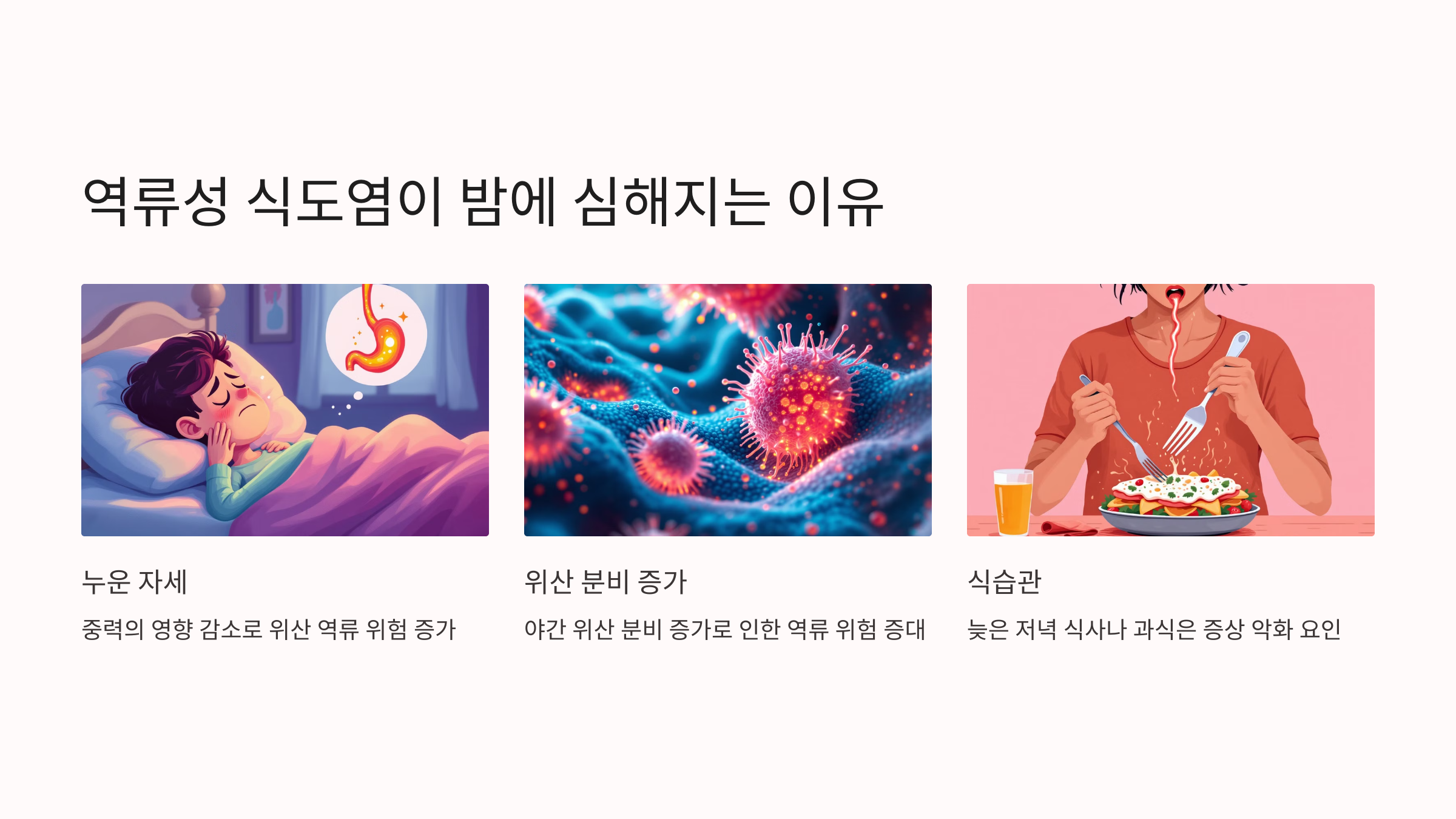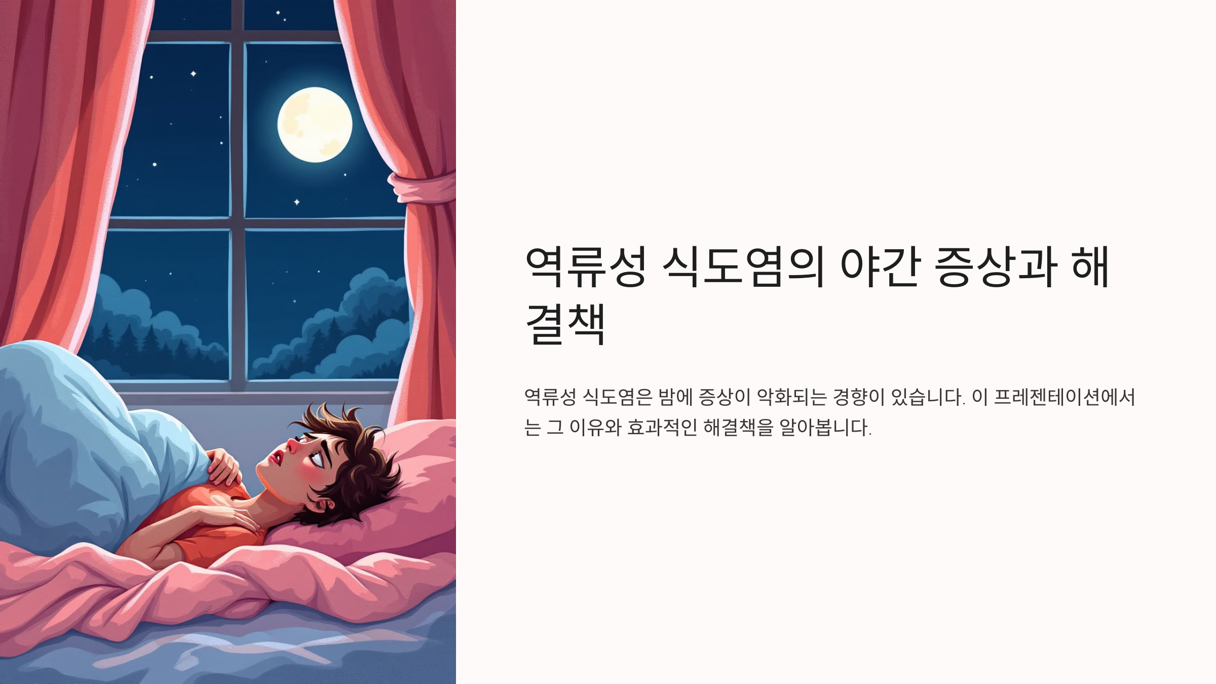 역류성 식도염은 밤에 증상이 악화되는 경향이 있습니다. 이는 눕는 자세, 위산 분비 증가, 잘못된 식습관 등 여러 요인에서 기인합니다. 하지만 몇 가지 생활 습관 개선과 치료 방법으로 야간 증상을 효과적으로 완화할 수 있습니다. 이 글에서는 그 이유와 해결책을 알아봅니다.