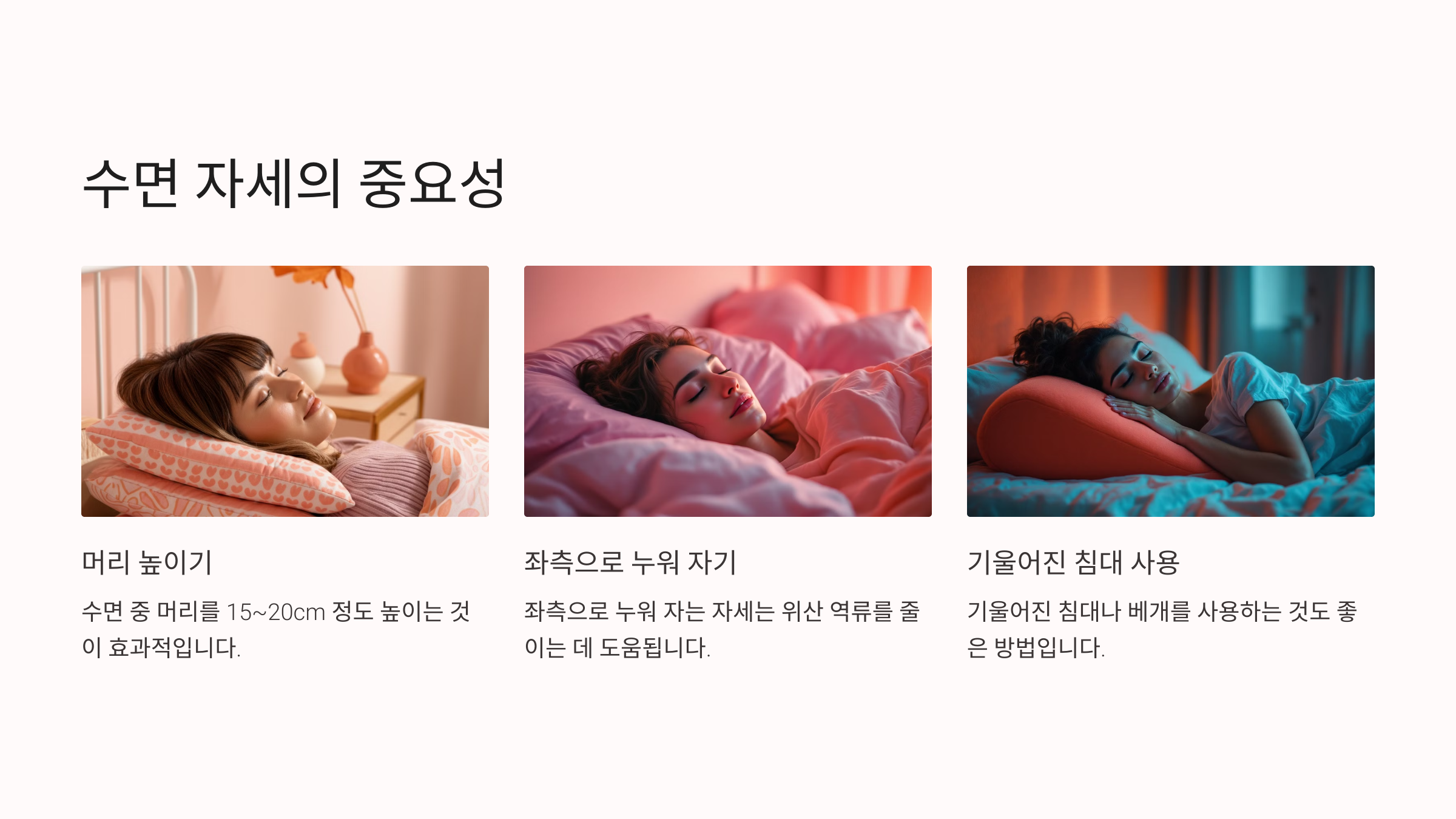 좌측으로 누워 자는 자세는 위산 역류를 줄이는 데 도움됩니다.
