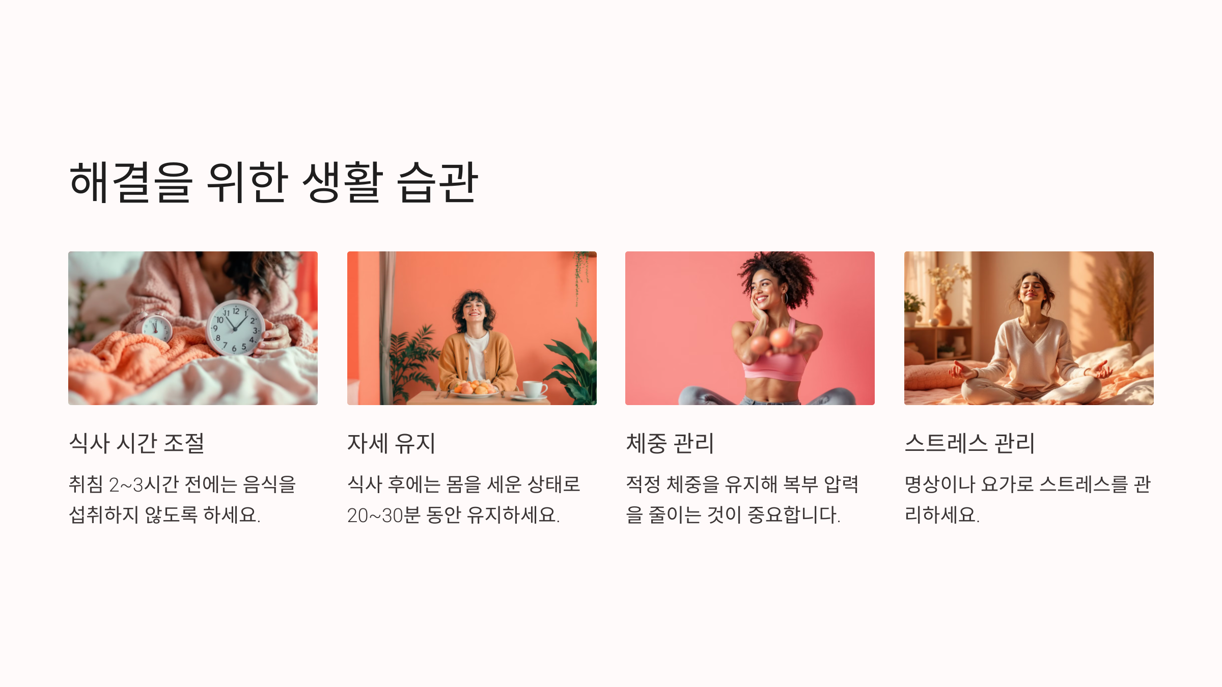 금연과 절주는 위산 분비와 식도 자극을 줄이는 데 도움됩니다.