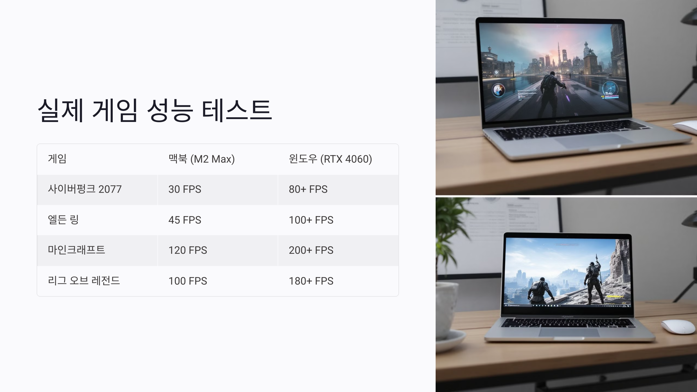 실제 게임 성능을 비교하기 위해 맥북과 윈도우 노트북에서 동일한 게임을 실행한 결과를 확인해 봤어요. 비교 대상으로는 M2 Max 칩을 탑재한 맥북 프로와 RTX 4060을 장착한 게이밍 노트북을 사용했어요.