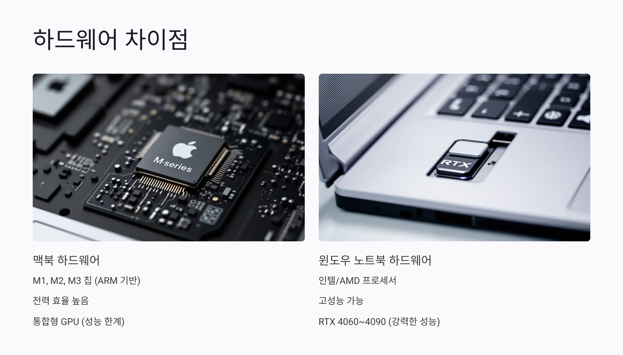 맥북과 윈도우 노트북은 기본적인 하드웨어 구조에서 큰 차이를 보이는데, 가장 중요한 요소는 CPU와 GPU 성능이에요.