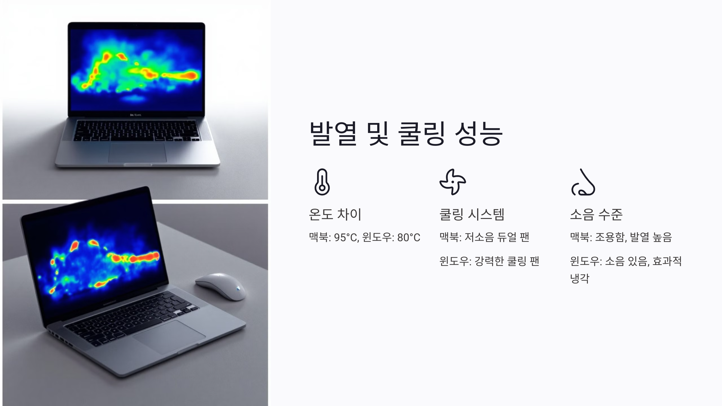 실제 테스트 결과, AAA급 게임을 30분 이상 플레이할 경우 맥북은 95°C까지 온도가 상승했으며, 윈도우 노트북은 80°C 내외로 유지되었어요.