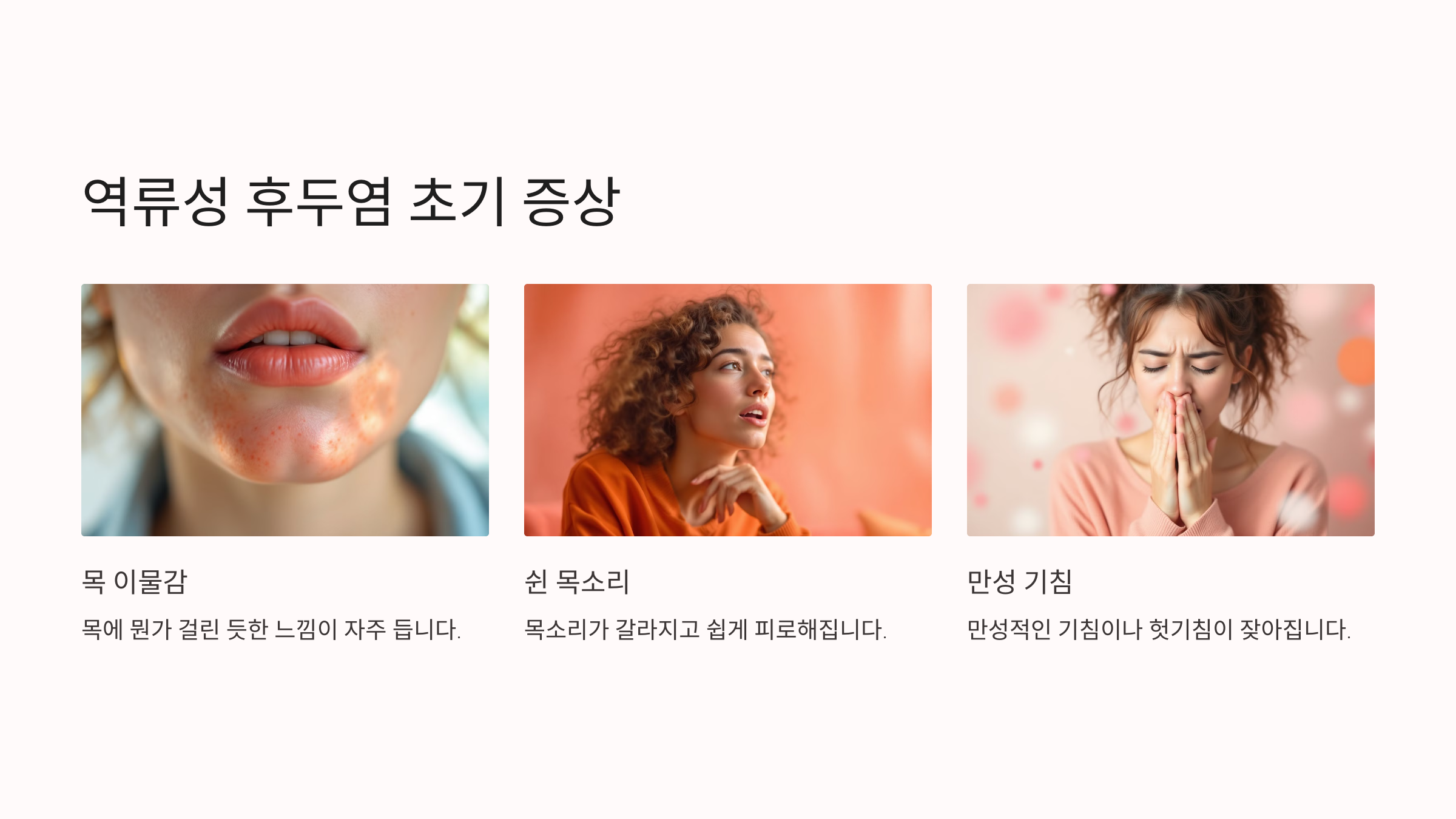 A: 목 이물감, 쉰 목소리, 만성 기침, 아침에 목이 따가운 증상이 초기 신호일 수 있습니다.