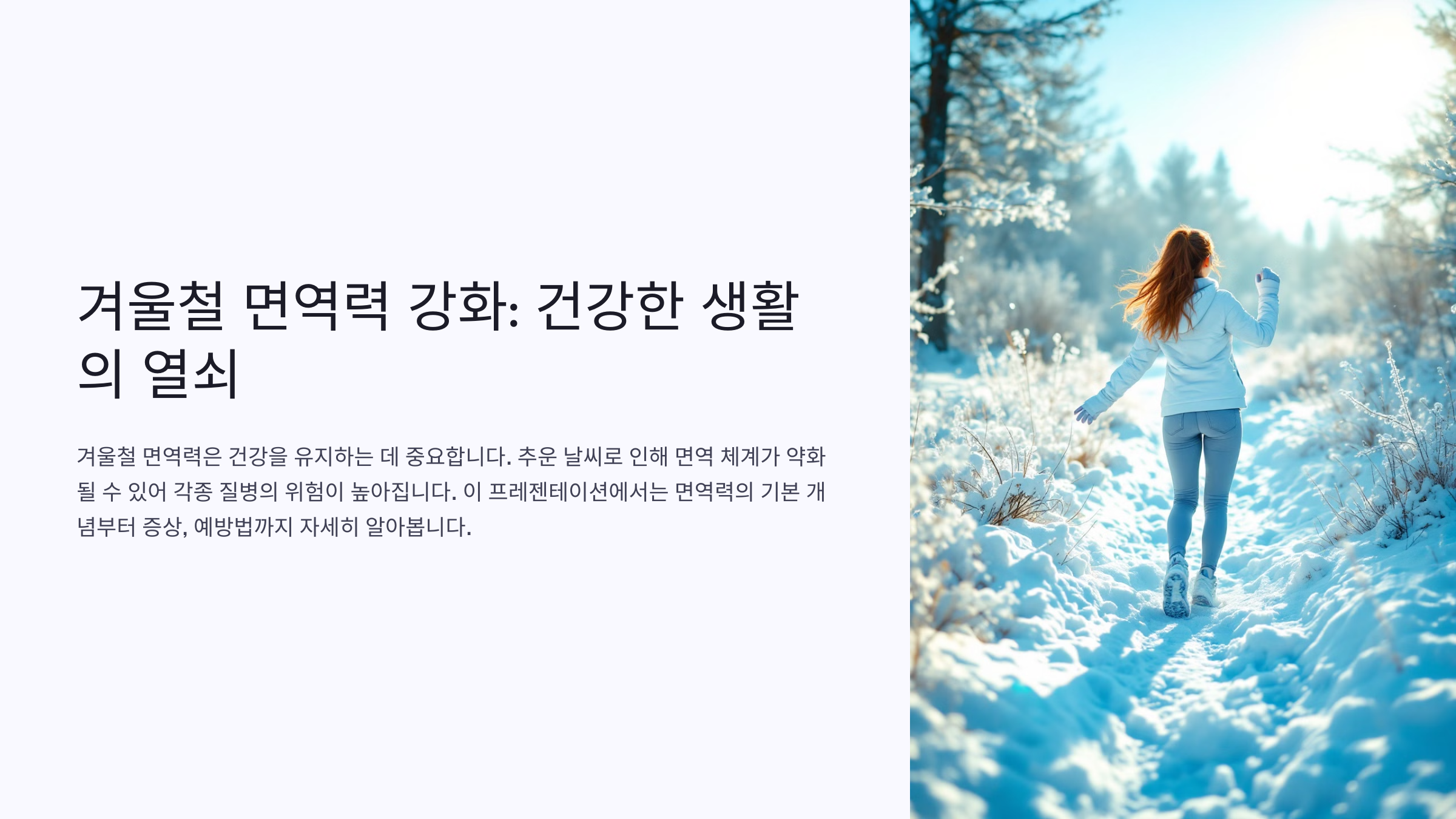 겨울철 면역력은 건강을 유지하기 위한 중요한 요소입니다. 날씨가 추워지면서 면역 체계가 약화될 수 있으며, 이는 각종 감염병과 질병의 위험을 높이는 요인이 됩니다. 이 글에서는 면역력의 기본 개념부터 주요 증상, 예방 방법까지 자세히 알아봅니다.
