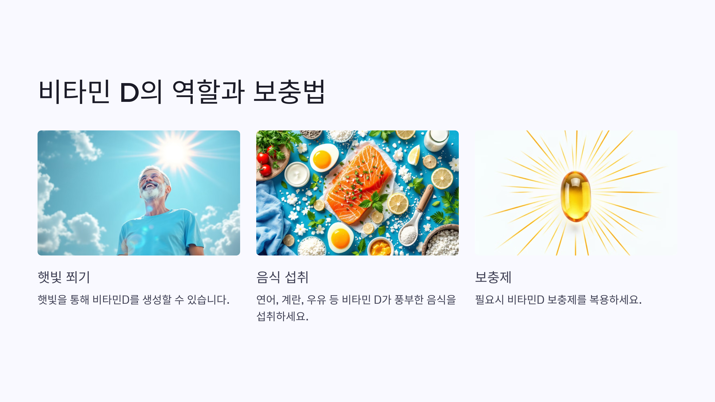 A: 햇빛을 쬐거나, 연어, 계란, 우유 같은 식품 섭취 및 보충제를 통해 보충할 수 있습니다.