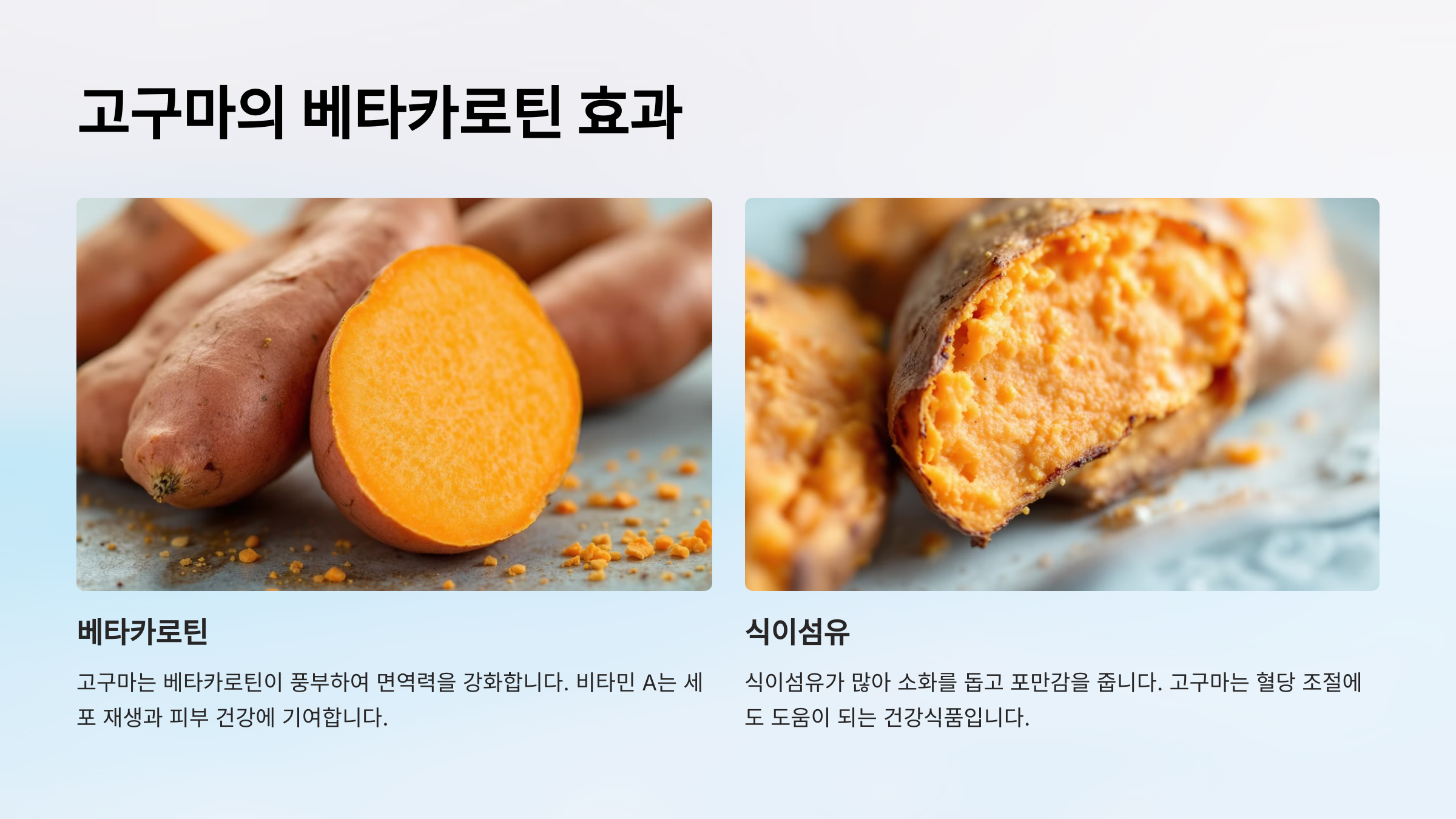 고구마는 베타카로틴이 풍부하여 면역력을 강화합니다.